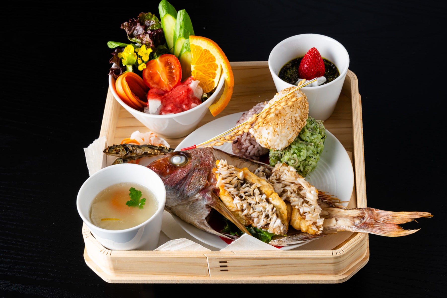 鱗をつけたまま素揚げ。鯛そのものの旨みや、パリパリとした鱗とふっくらとした身のコントラスをお楽しみいただけます。お好みで八女抹茶塩を付けてお召し上がりください。