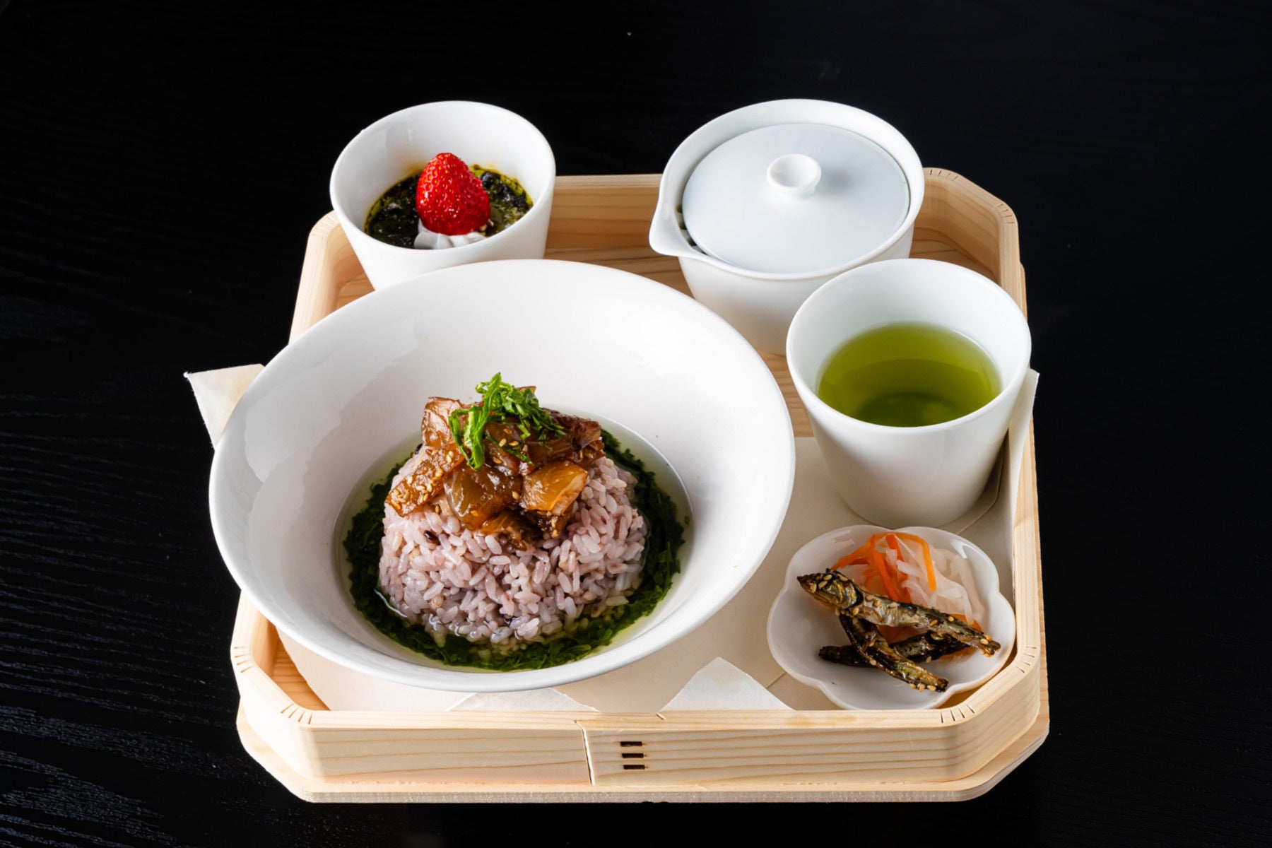 八女茶を余すことなくご堪能いただける一品です。 一口目は黒米と鯛の茶漬けを大葉と、二口目は八女