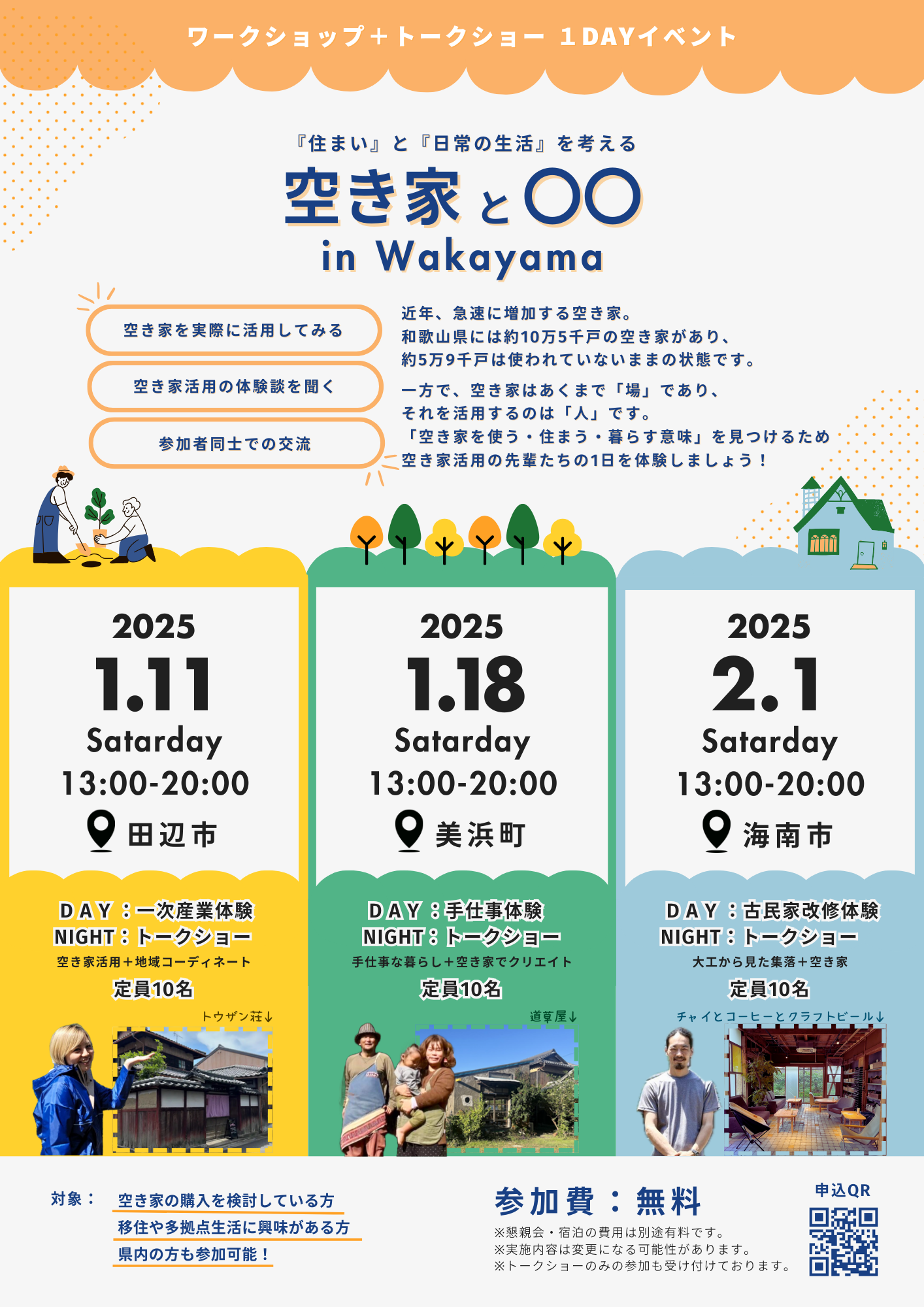 Kii-Labでは、和歌山で空き家を買い、やりたいことを実現する。空き家を生かした暮らしを実感してもらうための、ワークショップ+トークショーの1DAYイベントを2025年1月11日、1月18日、2月1日に実施いたします。