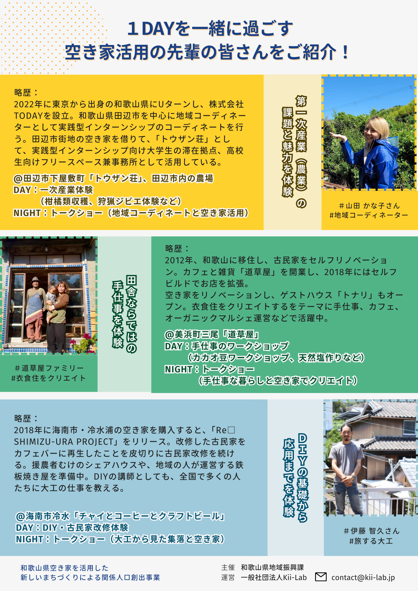 一方、空き家を活用することは、単なる物件再生にとどまらず、地域全体の魅力を引き出し、地域に新しい風を吹き込むことにも繋がります。本イベントは、日中は空き家を活用した生活(農業・カフェ・大工)を共に体験し、夜は和歌山県に移住され空き家を活用し様々な取組みを行っている3組を講師に迎えて、お話を伺います。