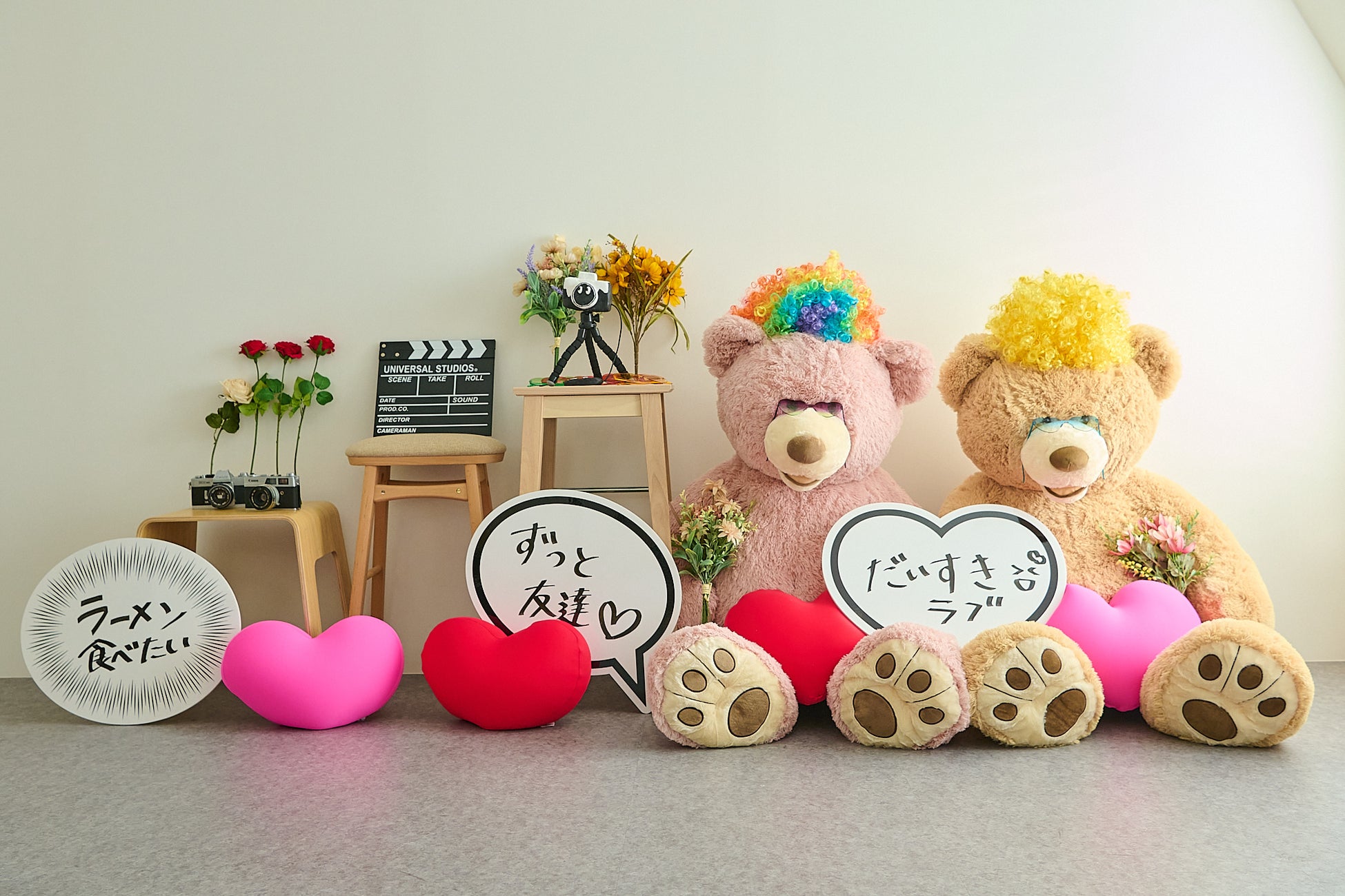大きなクマのぬいぐるみ、花束、サングラス、アフロのウィッグ、カメラ、カチンコ、ハートクッション、吹き出しボードなどセルフフォト撮影が楽しくなっちゃう小物が充実!