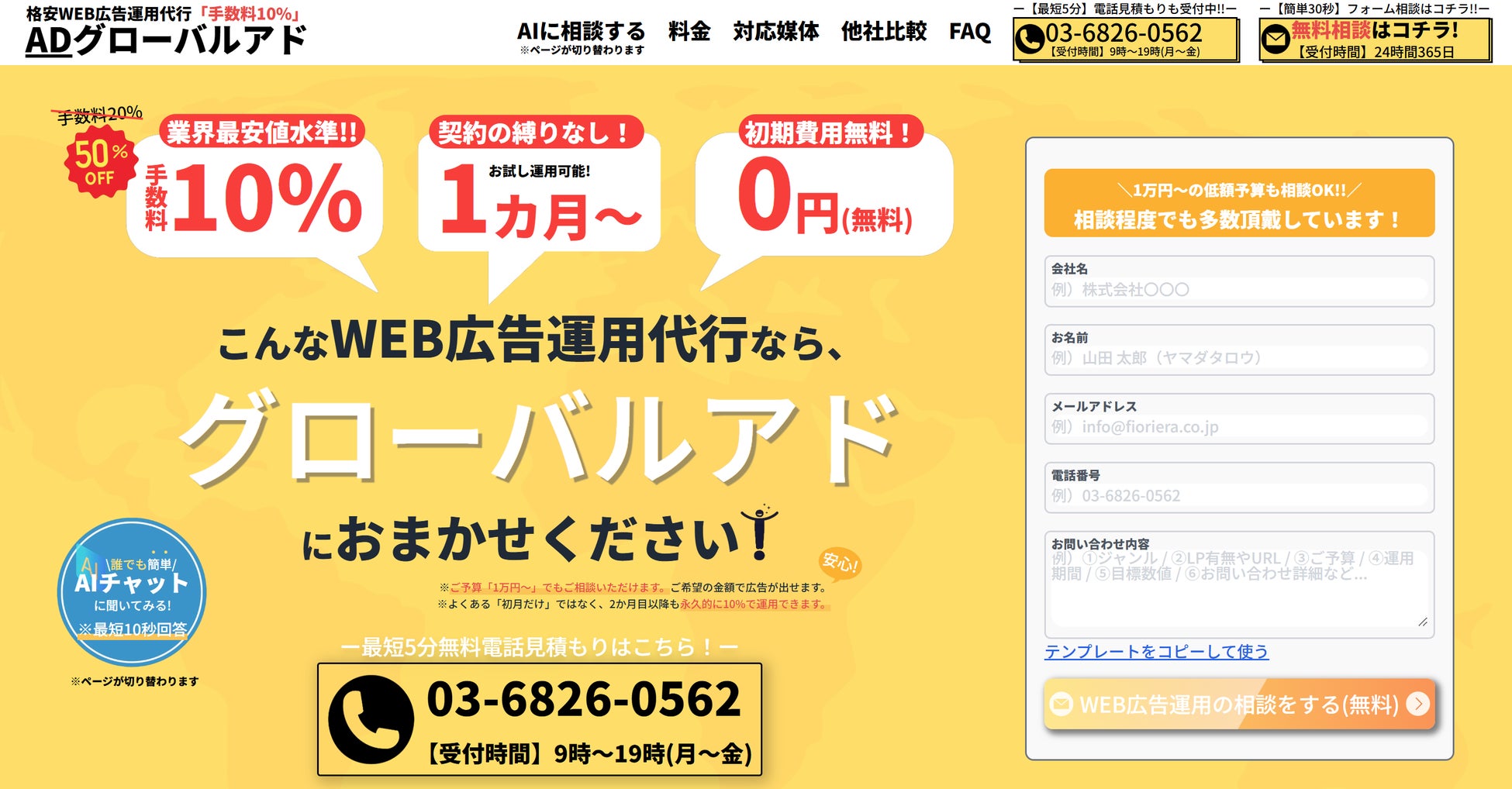 『グローバルアド』では金額面やWEB集客施策の検討段階からサポートできますので、初めてのWEB集客施策を検討している方でもお電話またはフォームよりお気軽にご相談ください。