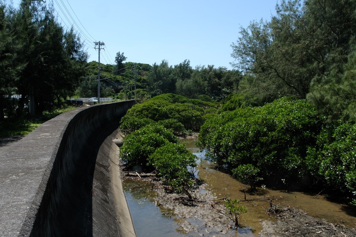 赤土等が海に直接流れ込まないよう河口域に設けられた「沈砂池」の現場を訪れ、赤土等の堆積状況、生物多様性の観点から外来種の生息状況等を観察します。
