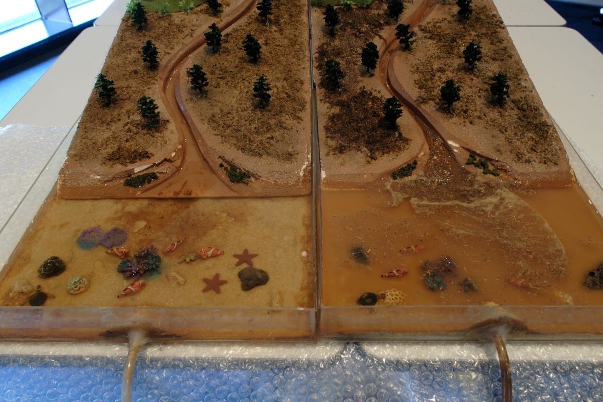 HCPの背景と目的、プロジェクトの仕組みや運営状況等の全体を解説します。赤土流出の構造と赤土流出対策の様子が目で見てわかる、模型を使ったデモンストレーションは、参加者の興味を高め理解を深めます。