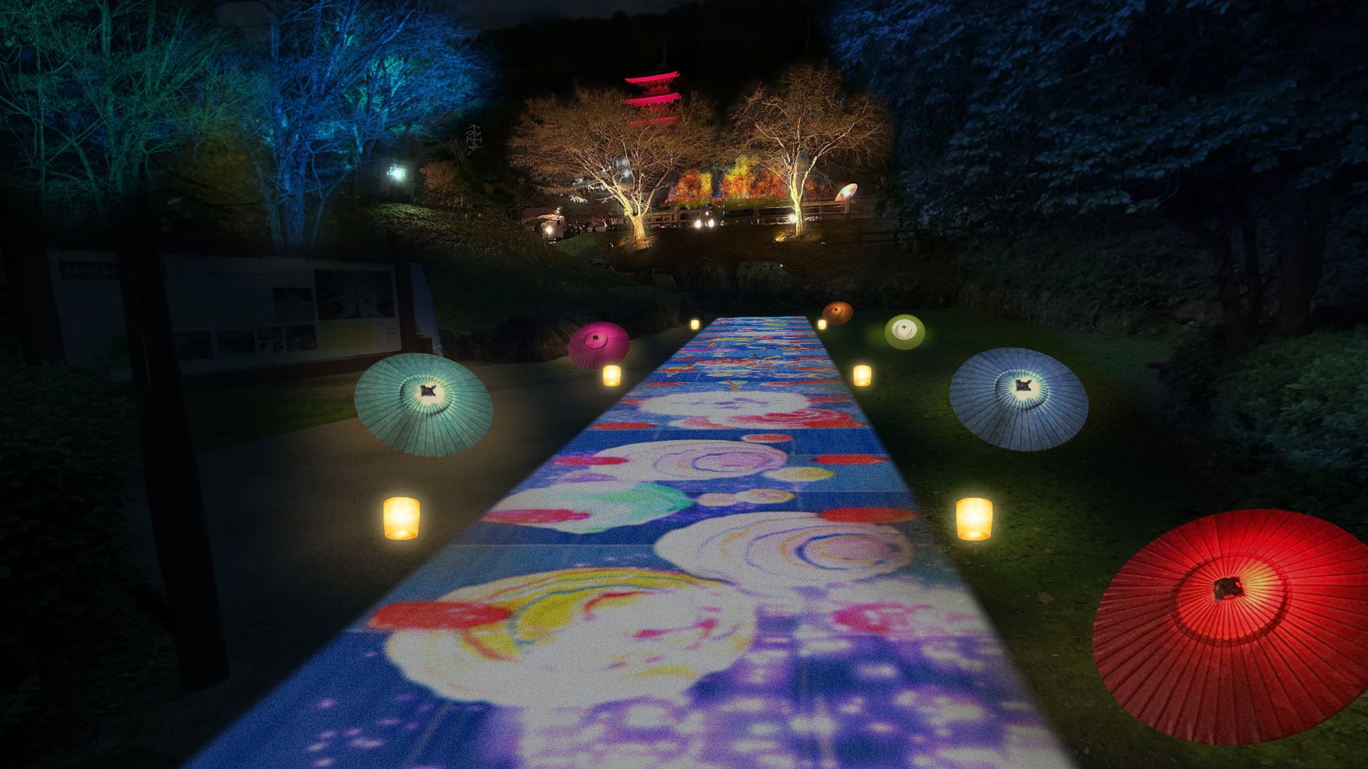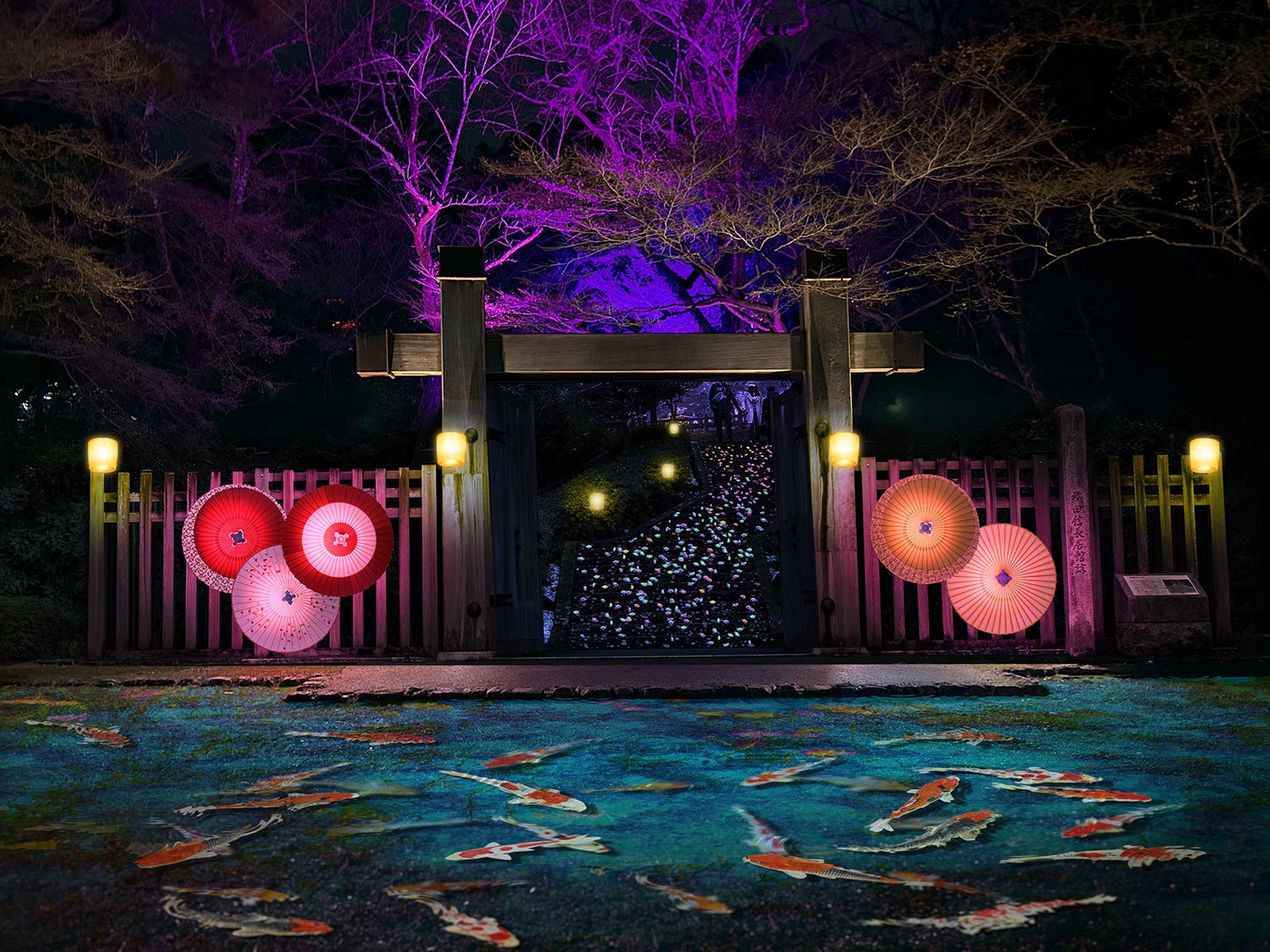 冠木門をくぐった先には、約50メートルにわたり、プロジェクションマッピングで描かれる清流が流れ、ヨーヨー風船や、錦鯉、花火といった日本の縁日を感じさせる演出を、にぎやかな雰囲気の光の参道が続く中で、楽しんでいただけます。