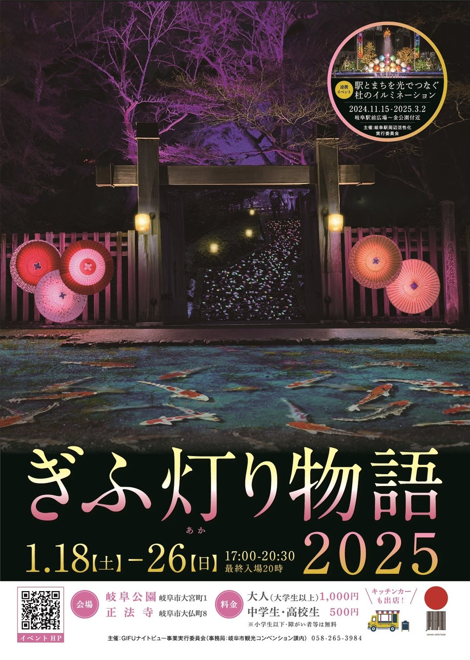 岐阜市の鵜飼のオフシーズンにおける魅力的なナイトタイムエコノミー創出のため、『ぎふ灯り物語 2025』を岐阜公園及び正法寺の2会場にて、2025年1月18日(土)から26日(日)まで開催いたします。