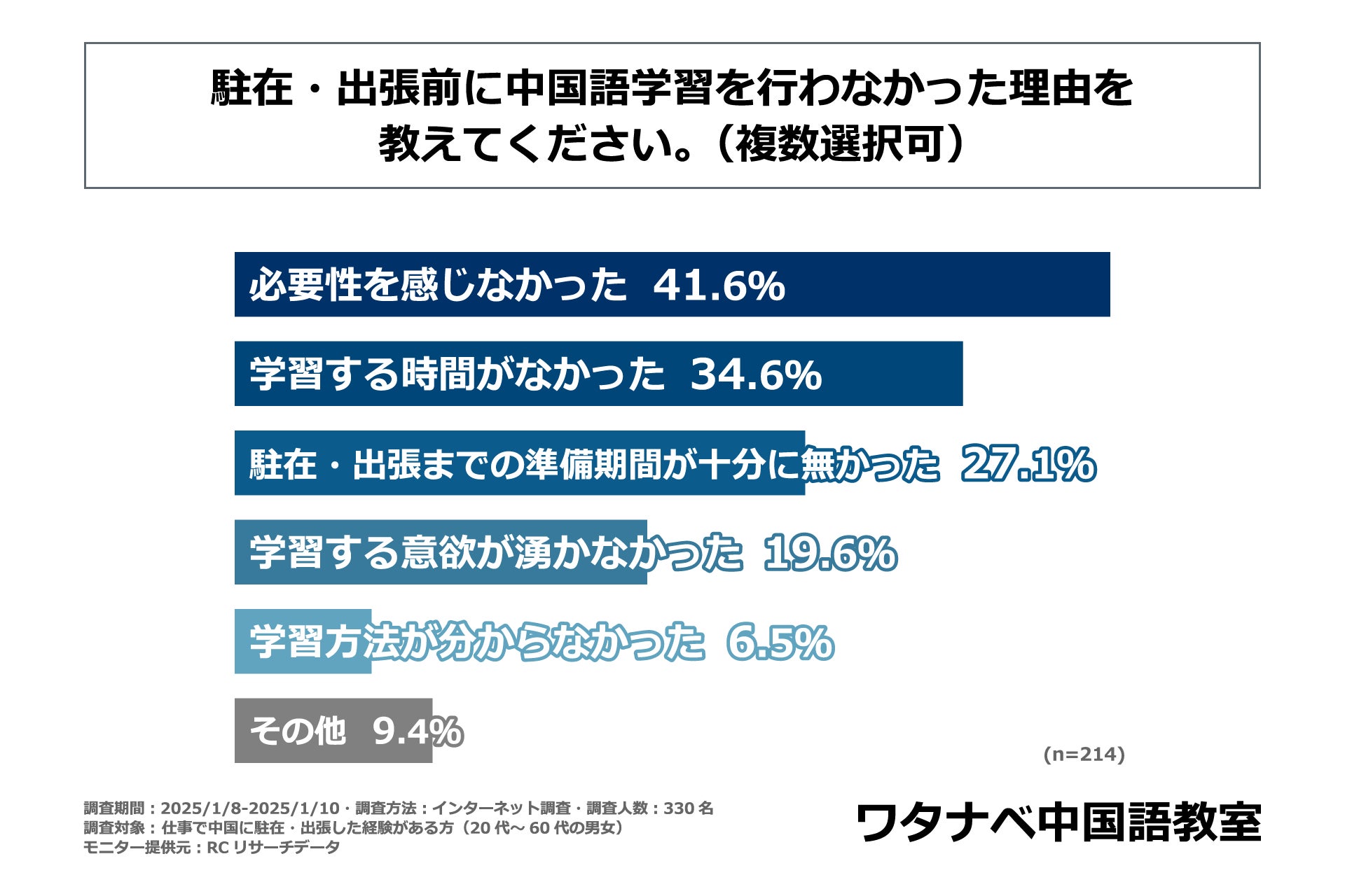 また、駐在・出張前に、中国語学習を行っていないと回答された方に「駐在・出張前に中国語学習を行わなかった理由」を尋ねる設問への回答では、1位が「必要性を感じなかった」で41.6%、2位が「学習する時間がなかった」で34.6%、3位が「駐在・出張までの準備期間が十分に無かった」で27.1%という結果になりました。この結果から、約3割の方は学習時間及び環境を用意できなかったことが原因で、勉強しなかったこと判明しました。
