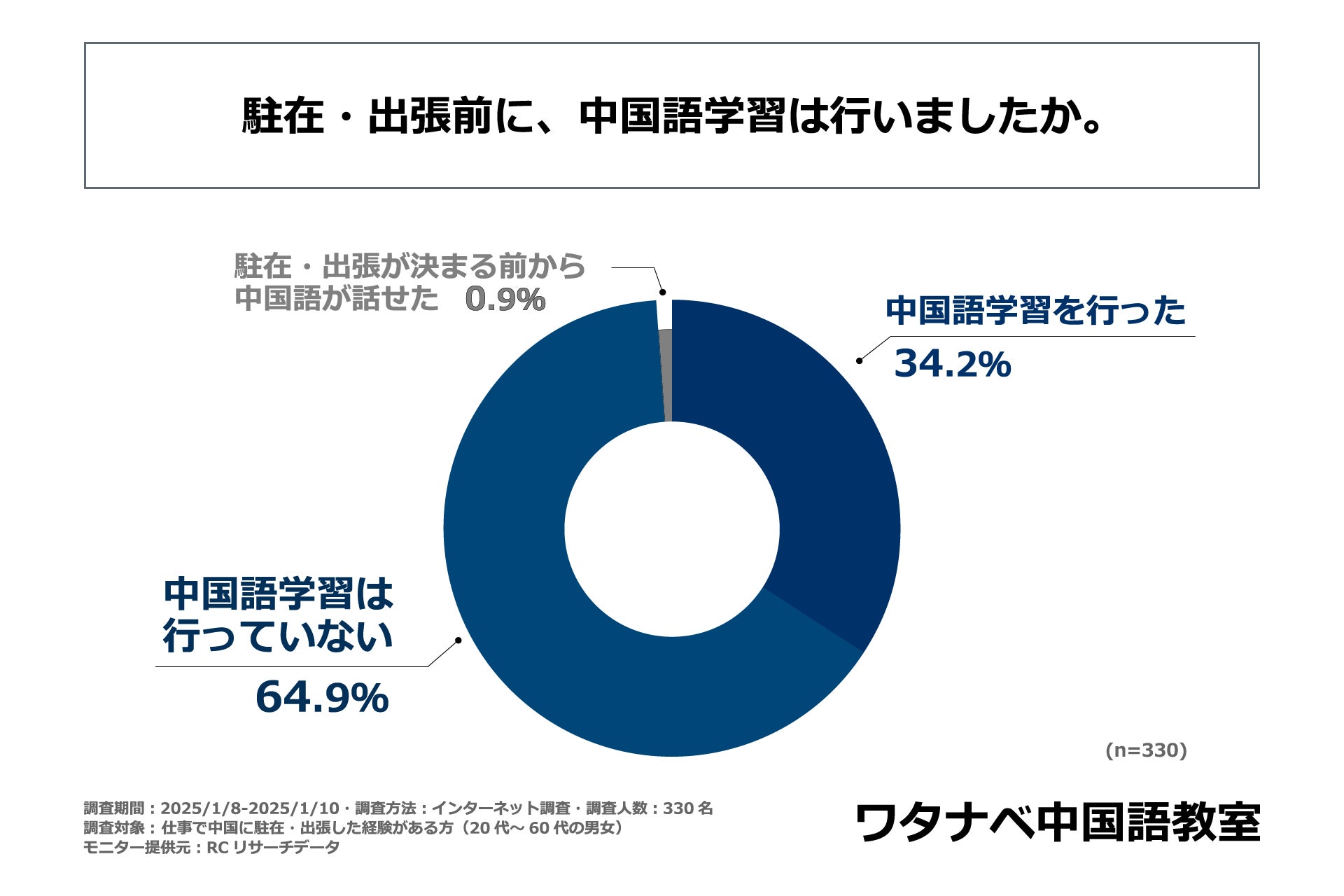 続いて「駐在・出張前に、中国語学習を行ったか」を問う設問への回答では、「中国語学習は行っていない」が64.9%、「中国語学習を行った」が34.2%という結果になりました。今回の調査対象者は、1ヶ月未満の駐在・出張経験者が66.9%に上ることから、短期間の駐在・出張の場合、中国語の学習をせずに駐在・出張されている方が多いことが明らかになりました。
