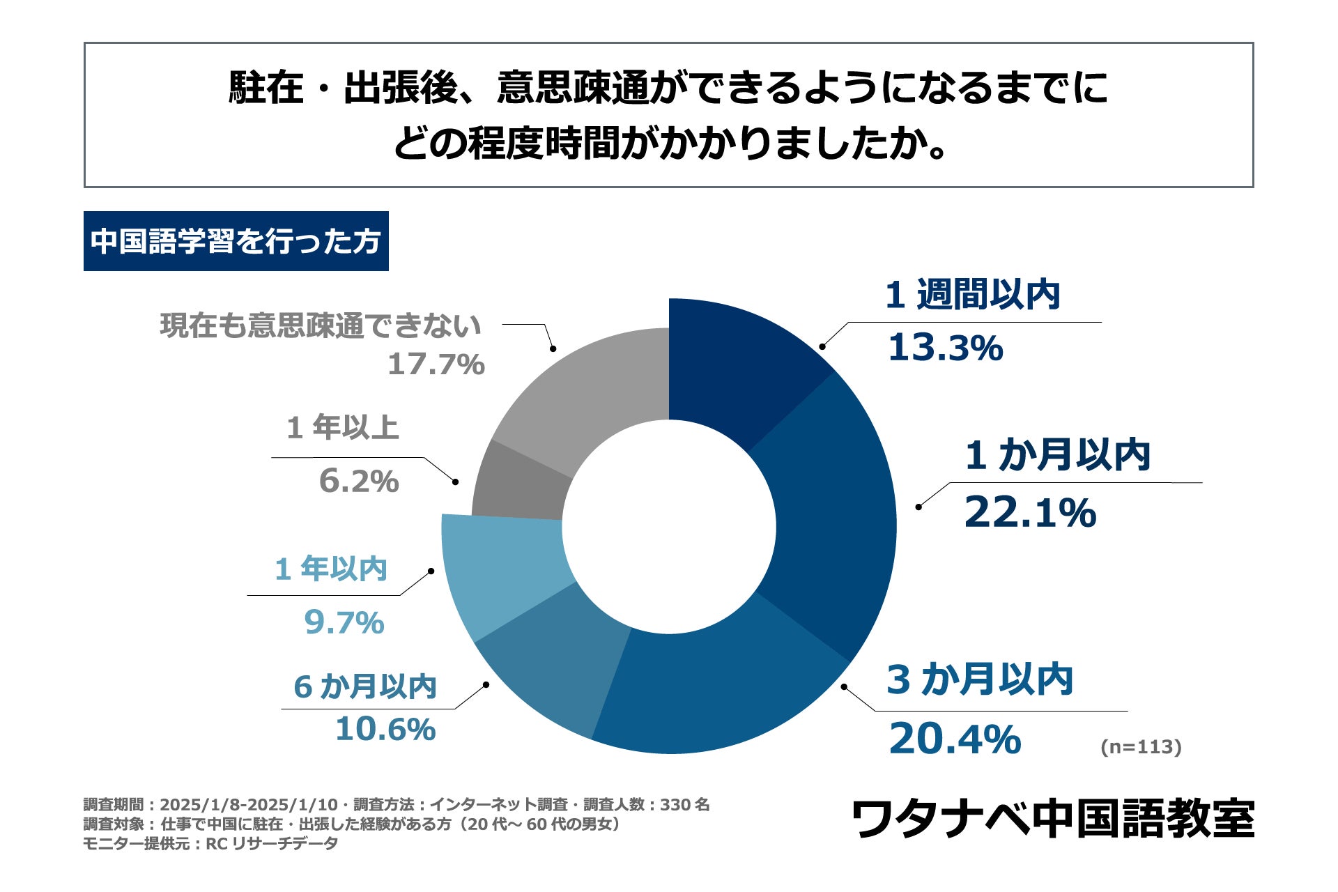 また、駐在・出張前に、中国語学習を行ったと回答された方に「駐在・出張後、意思疎通ができるようになるまでにどの程度時間がかかったか」を尋ねる設問の回答では、1位が「1か月以内」で22.1%、2位が「3か月以内」で20.4%という結果となりました。また、「1週間以内」と回答された方も13.3%おり、これらの回答を合計すると、55%以上の人が「3か月以内」には意思疎通ができるようになっていることがわかりました。