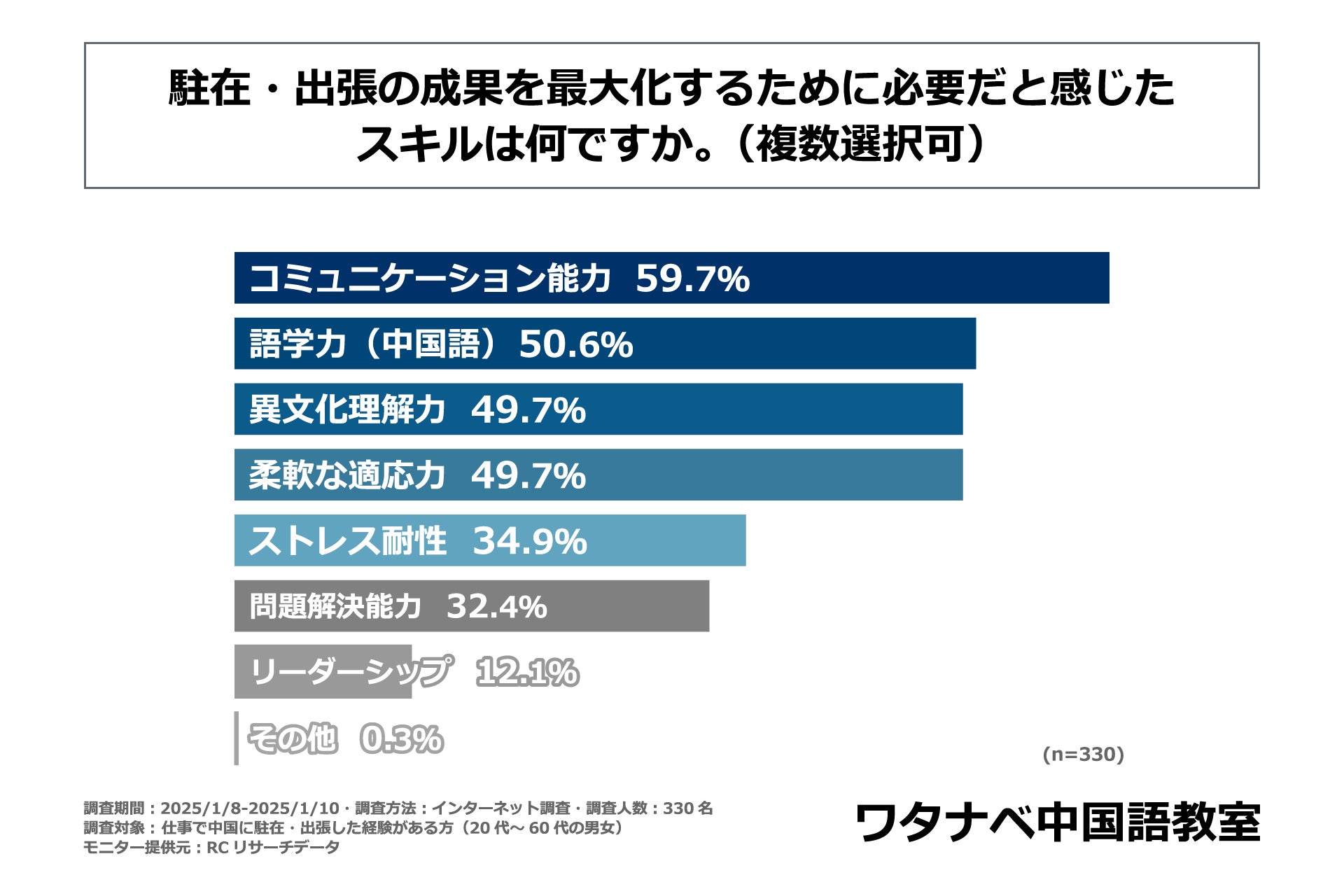 次に「駐在・出張の成果を最大化するために必要だと感じるスキル」を尋ねる設問への回答では、1位が「コミュニケーション能力」で59.7%、2位が「語学力(中国語)」で50.6%という結果になりました。この結果から、語学力とコミュニケーション能力は異なる能力であり、成果を最大化するためにそのいずれの能力も重要だと感じた駐在・出張経験者が多いことがわかりました。