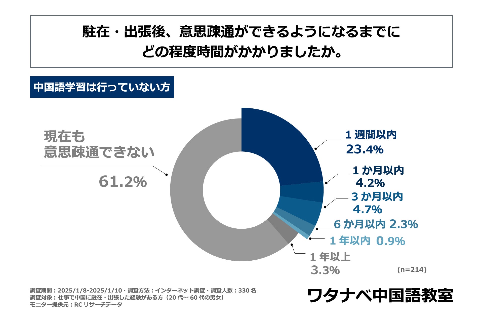 次に、駐在・出張前に、中国語学習は行っていないと回答された方に「駐在・出張後、意思疎通ができるようになるまでにどの程度時間がかかったか」を尋ねる設問では、1位が「現在も意思疎通ができない」で61.2%という結果となり、駐在・出張前に中国語学習を行っていない人の大半は、現在も意思疎通ができない、ということが判明しました。
