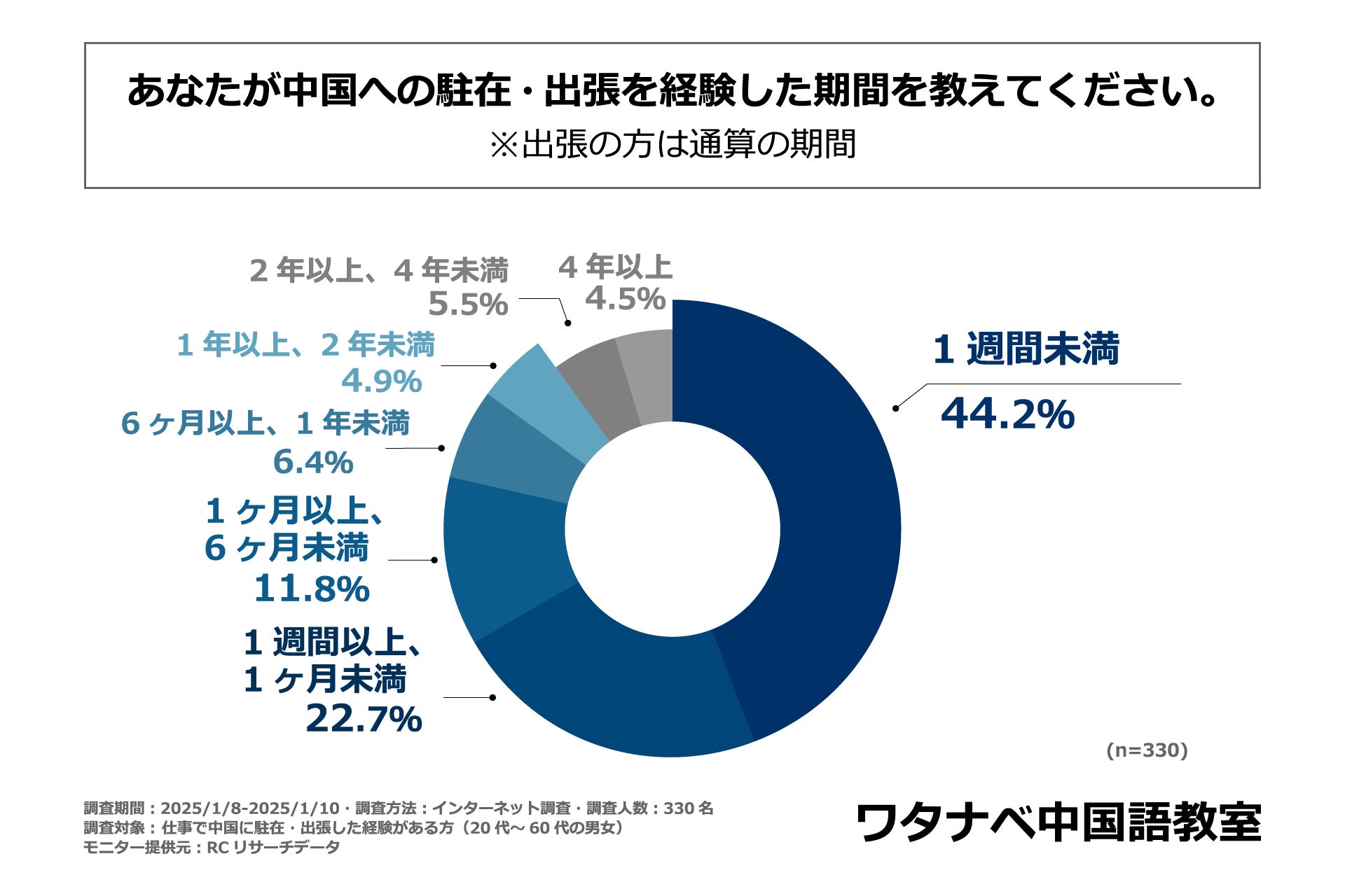今回の調査対象者で最も多いのは「1週間未満」の出張者で44.2%、ただ、「通算1年以上」中国へ滞在した経験を持つ出張者・駐在者も15%含まれる