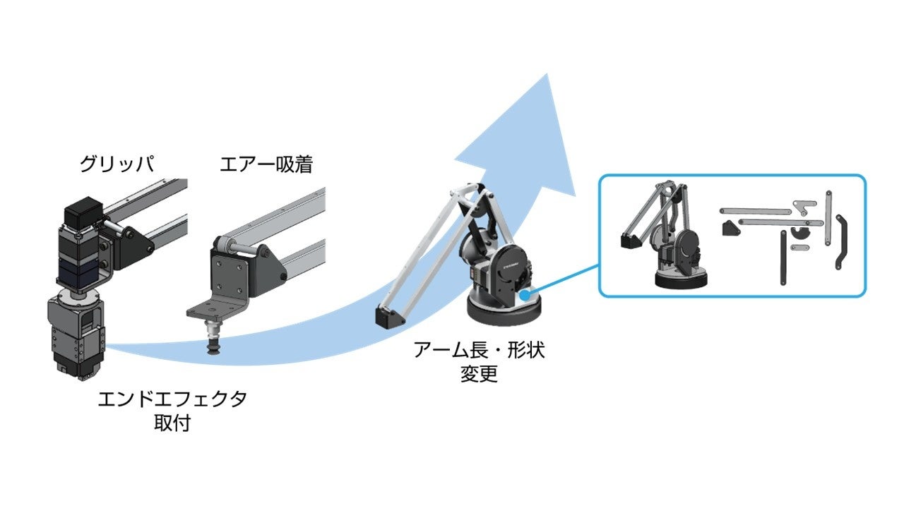 アーム部品の交換が可能です。アームの長さ、形状をカスタマイズすることで、可動範囲を拡大できます。また、エンドエフェクタの取付も容易なため多種多様なパーツを組み替えてオリジナルのロボットを創り出すことができます。