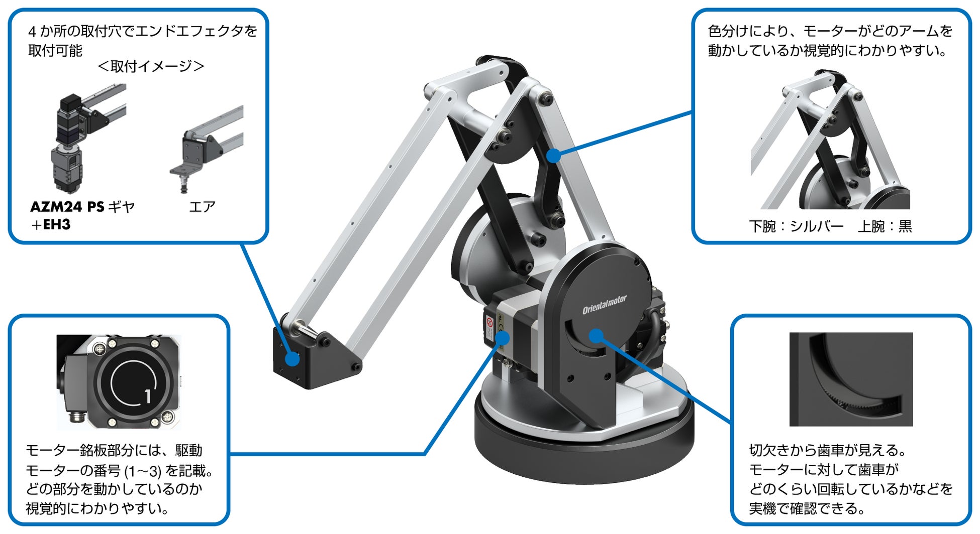 本体はロボットの構造やメカニズムの学習のために工夫した構造を採用し、ソフト面ではコマンドアイコンを利用したノーコードプログラミングにより、素早く「こんな風に動かしたい」を実現します。教室や実験室の卓上などでの学習のしやすいさを重視し、産業用ロボットの導入費用は一般的に数百万円~に対して、ロボット、コントローラ、ドライバ、ケーブルのセットで販売価格49万8千円(税抜)と価格を抑えることでロボット人材教育に幅広く活用いただけるように企画した初学者向け教育ロボットです。ロボット単体での販売も行います。当社WEBサイトでの販売は2025年1月を予定しています。
