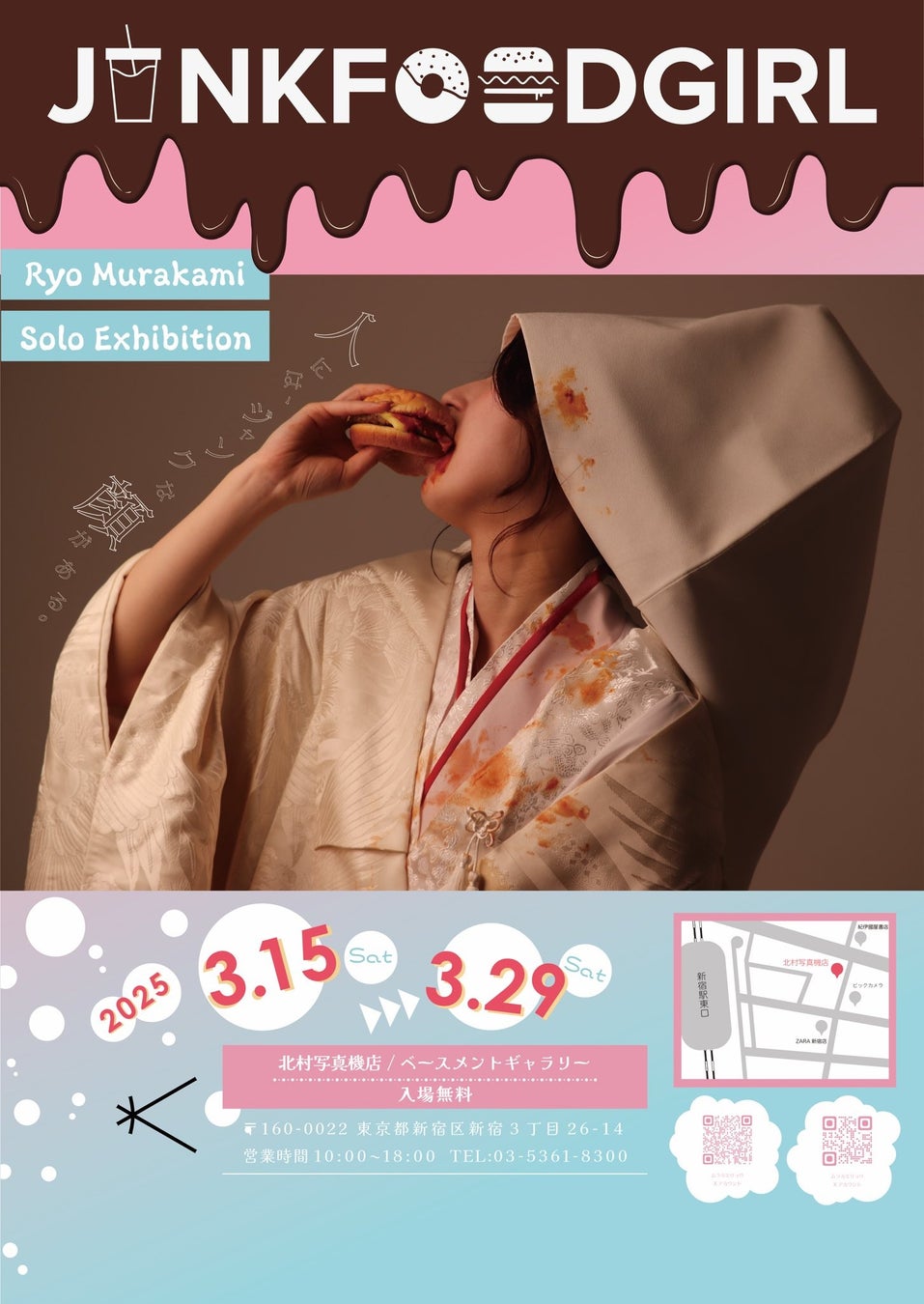 2025年3月15日(土) – 2025年3月29日(土)、新宿 北村写真機店B1Fベースメントギャラリーにて、ムラカミリョウ単独の写真展「JUNKFOODGIRL®︎」を開催いたします。