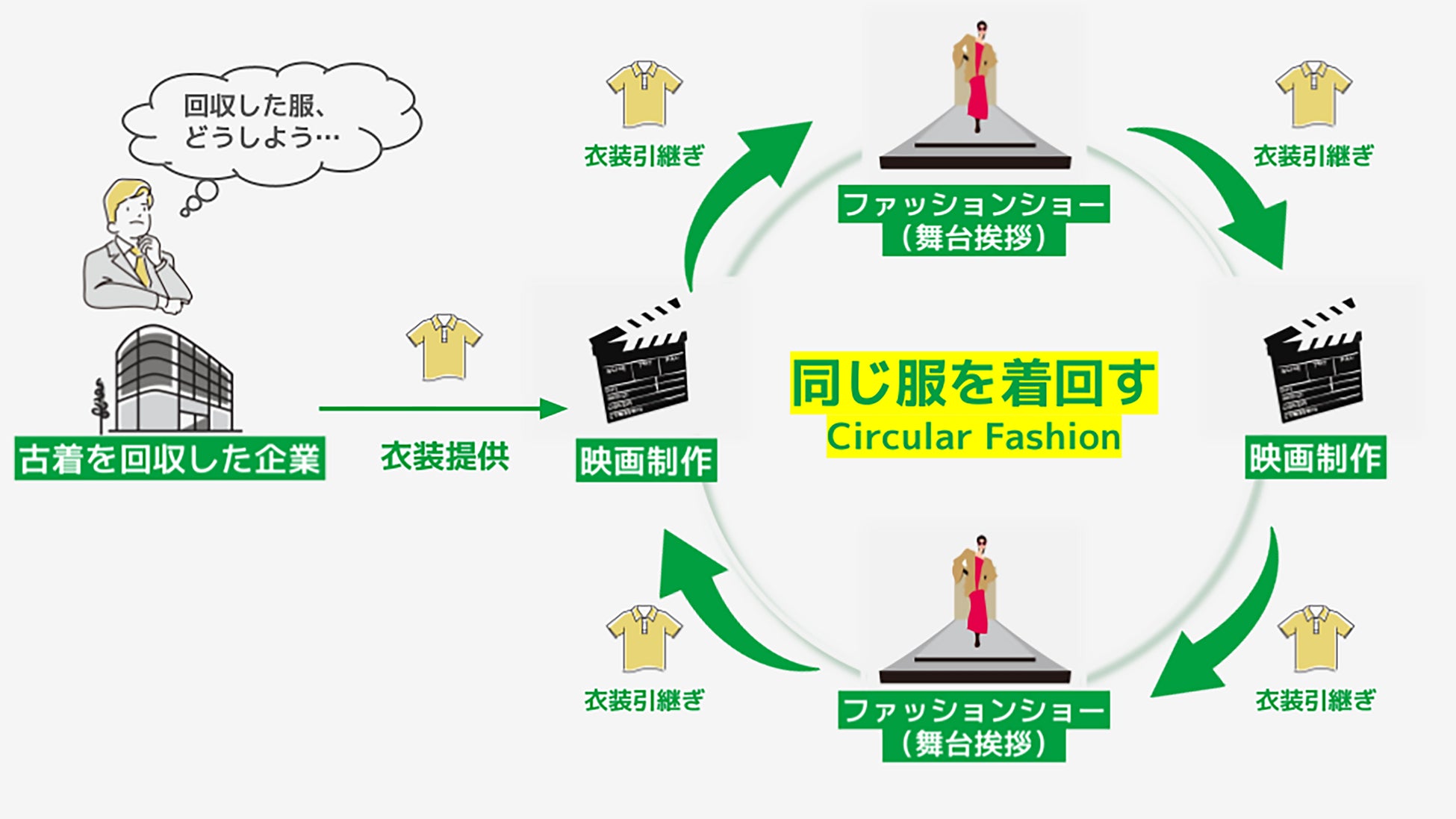 SDGsの意識が高まる昨今、古着を回収するサービスは多いものの、"集めた古着の行き場がない"という問題があります。こうした実情を知り、本作では、出演者達が不用品回収倉庫に赴き、自ら選んだ古着を映画の衣装として使用し古着の付加価値を高める、といった古着のリユース施策に取り組みました。