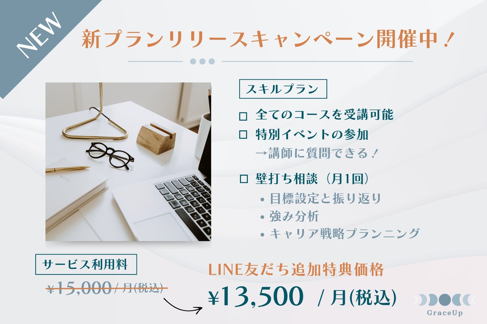 また、GraceUp公式LINEのお友だち登録者限定で、スキルプランの月額料金が15,000円から13,500円に割引されるキャンペーンを実施中です(先着10名様)。ぜひこの機会にご登録ください。
