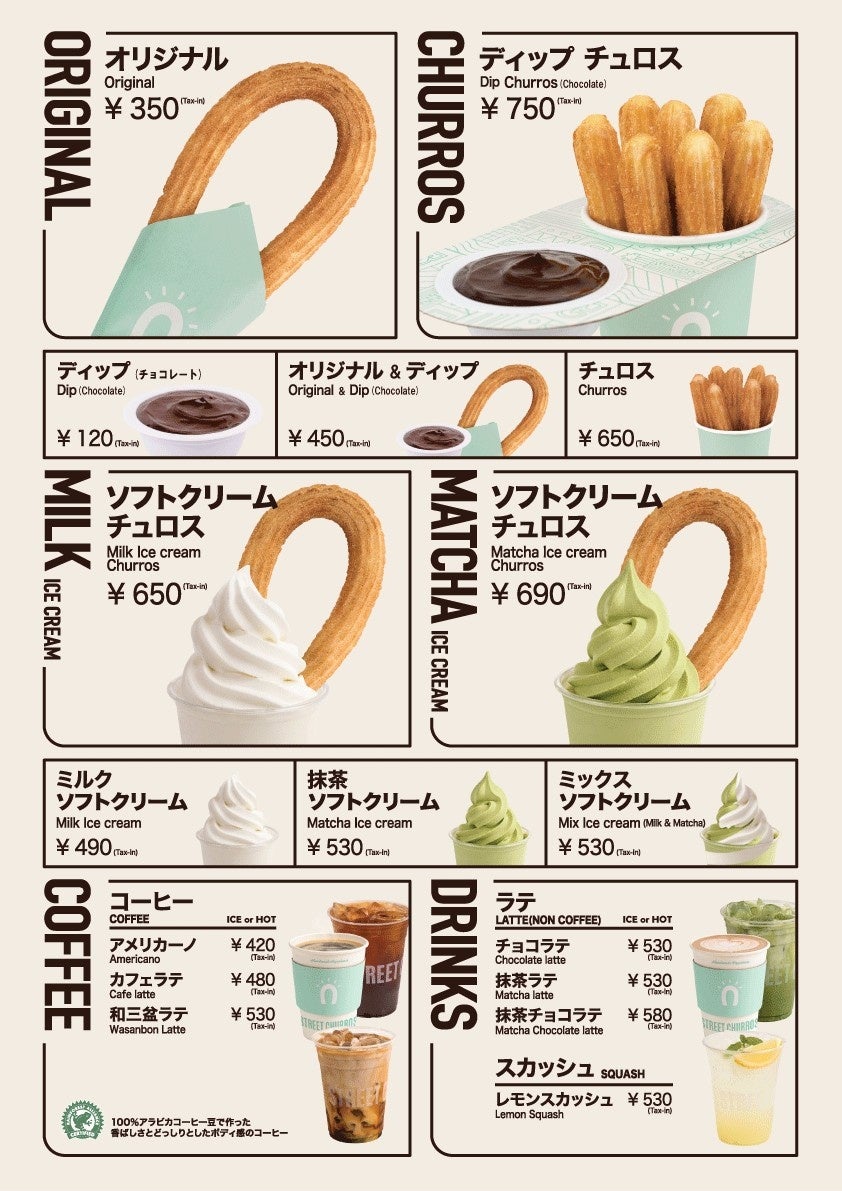 グランドオープンで購入可能な商品は、チュロス6種、ソフトクリーム3種、ドリンク7種です。シナモンシュガーをまとった「オリジナル」の他に、チョコレートディップチュロスやソフトクリームチュロスがあり、日本限定の抹茶ソフトクリームもあります。今後はディップの種類を増やし、ホットドッグ状のチュロスなども順次販売していく予定です。