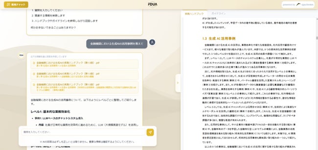 株式会社Ippu Senkin(本社所在地:東京都中央区、代表取締役 CEO:鈴木 秀弥、以下「当社」)は、一般社団法人金融データ活用推進(本社所在地:東京都中央区、代表理事:岡田 拓郎、以下「FDUA」)が公開している「金融機関における生成AIの開発・利用に関するガイドライン(第1.0版)」及び「金融機関における生成AIの実務ハンドブック(第1.0版)」(以下、「FDUA生成AIガイドライン」)をRAG(Retrieval Augmented Generation)※1により取り込んだ生成AIチャットボットを、FDUA会員向けにリリースいたしました。これにより、金融機関などの会員は、最新のガイドラインや実務知見をわかりやすくかつ効率的に参照することができます。ガイドラインの認知・浸透を一層促進することで、金融業界全体におけるAI活用の高度化に貢献いたします。