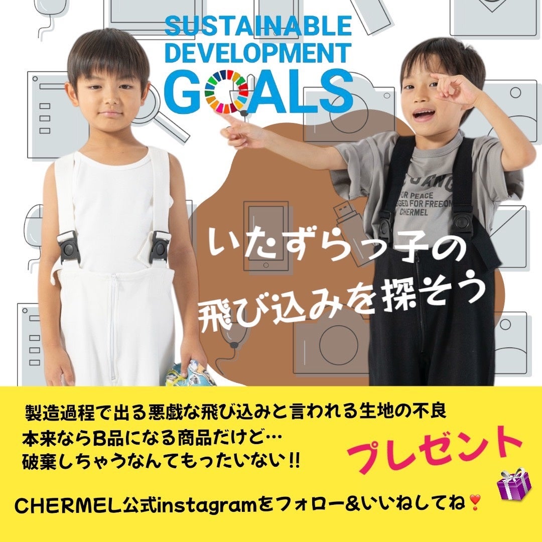 CHERMELでは、プロジェクト開始を記念して、Instagramキャンペーン「いたずらっ子の飛び込みを探そう」を実施します。このキャンペーンでは、製造過程で発生する「飛び込み」を活かしたキッズウェアをプレゼントし、消費者に生地廃材の背景を知っていただくとともに、楽しみながら参加できる機会を提供します。