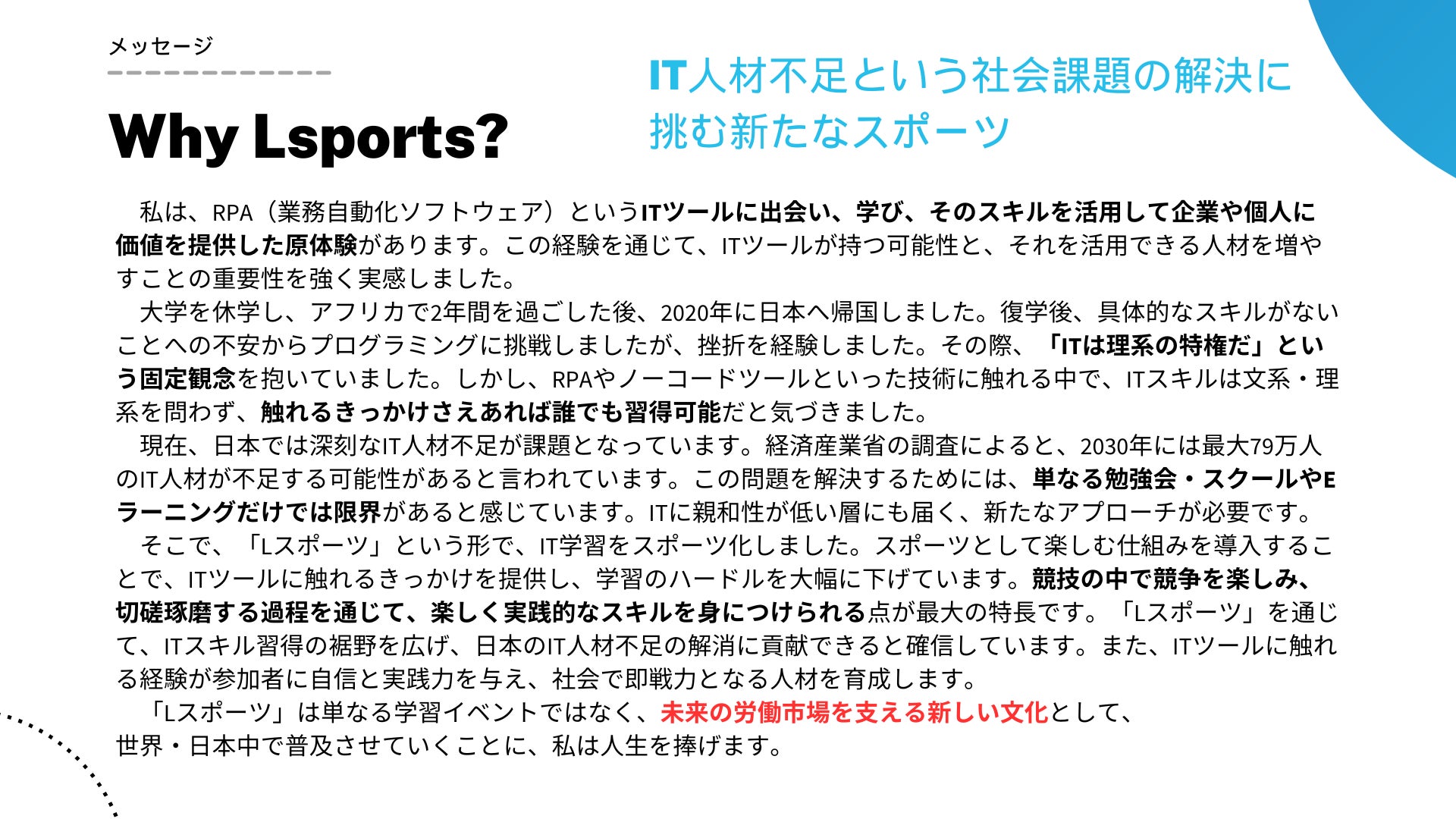 また、今後は地方自治体や学校との連携を強化し、地域ごとの特色を活かしたLスポーツイベントの展開も進めていきます。本協会は、ITスキルを楽しく学びながら、より多くの人々がデジタル社会で活躍できる場を創り出します。