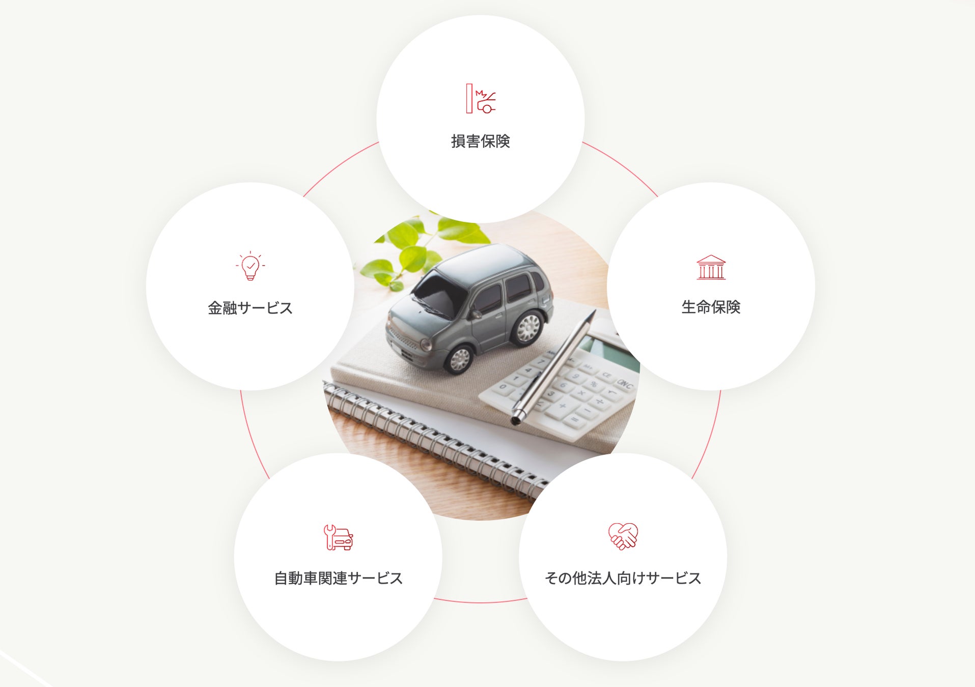 保険や金融サービスに加え、カーライフやその他多彩なサービスを一括で提供できる企業は珍しく、私たちはその一翼を担っています。 これらのサービスは単独でのご利用はもちろん、組み合わせることで経費削減や管理・時間コストの効率化など、付加価値を生み出します。