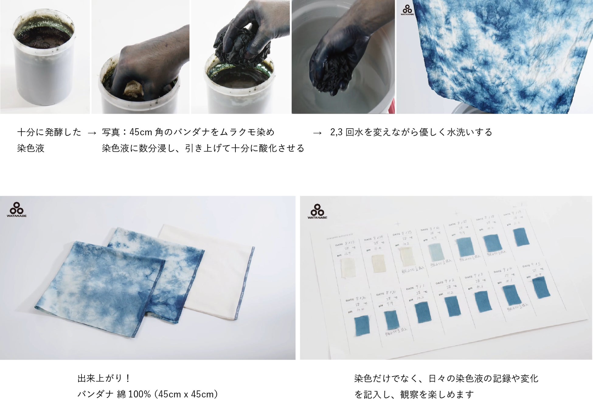 また、藍職人によるわかりやすい「蒅藍建てキット」の説明動画や、よくある質問に対する動画解説、さらに職人の現場から届けられる最新情報を楽しめるYouTubeチャンネル( Watanabes-Laboratory )もご用意しています。染色体験だけでなく、その発酵の様子を観察することで、日本の藍染め文化の奥深さを存分に感じていただけます。
