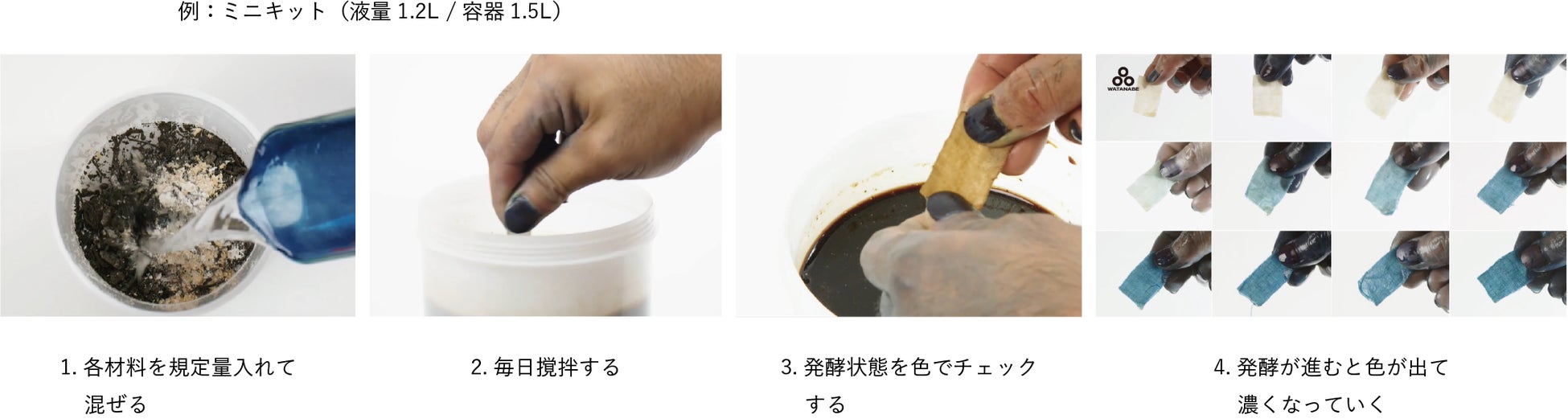 染色液の使用期間は、発酵染色液の管理状況や染色量によって異なります。ミニキットの使用期間目安は1ヶ月〜3ヶ月と想定しています。Watanabe’sの実績としては、ミニキットでは6ヶ月使用可能です。