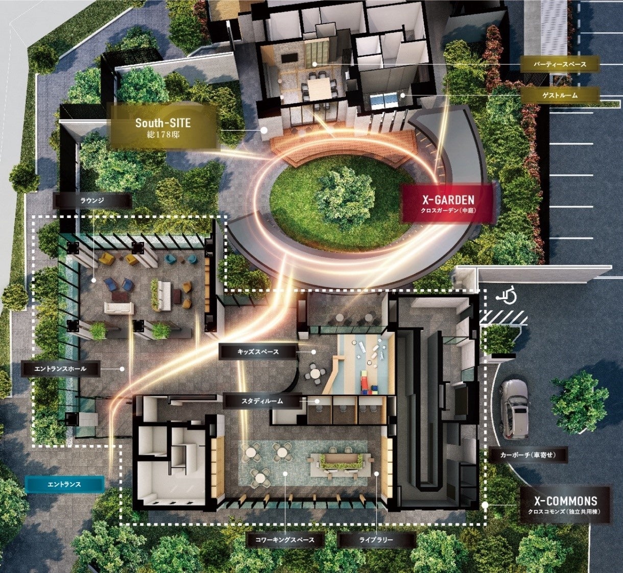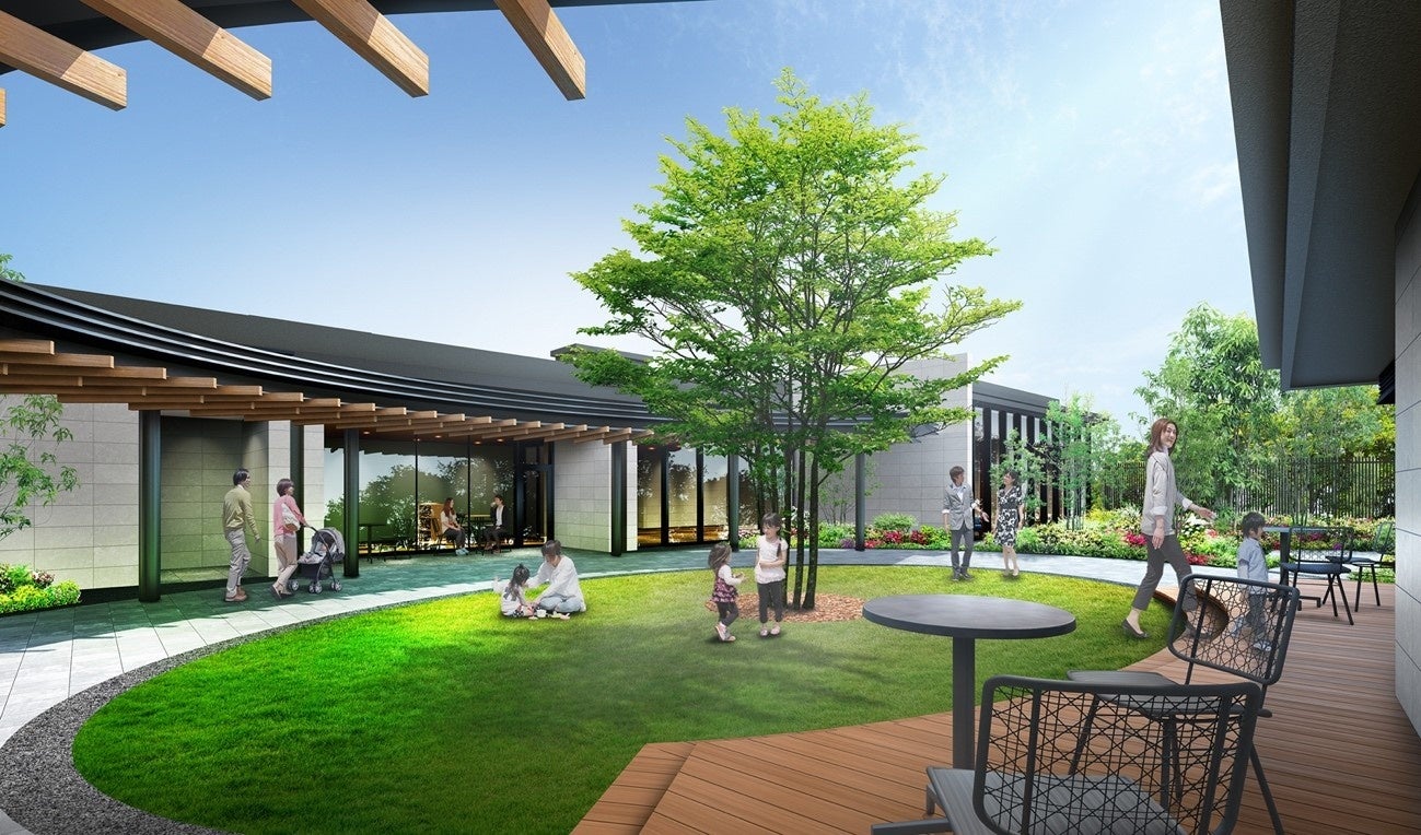 敷地内の動線計画にも創意工夫を凝らし、エントランスから住棟に向かう際に必ず中庭の「X-GARDEN(クロスガーデン)」を、あるいはその周囲に配した楕円状の回廊を通る動線計画とすることで、居住者同士がマンション内を行き来する中で自然に顔を合わせる機会を創出します。また、緑と四季の彩り豊かな「X-GARDEN」にはシンボルツリーを中心に人工芝を敷き詰め、さらにウッドテラスを配することで、外での遊びやくつろぎを気軽に楽しめるように配慮しています。