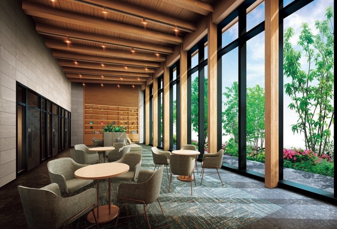 ◎ 敷地内に「なんかいの森」で間伐した天然木を一部使用したRCと木造のハイブリッド※の独立共用棟や、シンボルツリーのある中庭を擁した共用空間「X-TERRAce(クロステラス)」をつくることで多世代が交流しやすいしかけを創出。