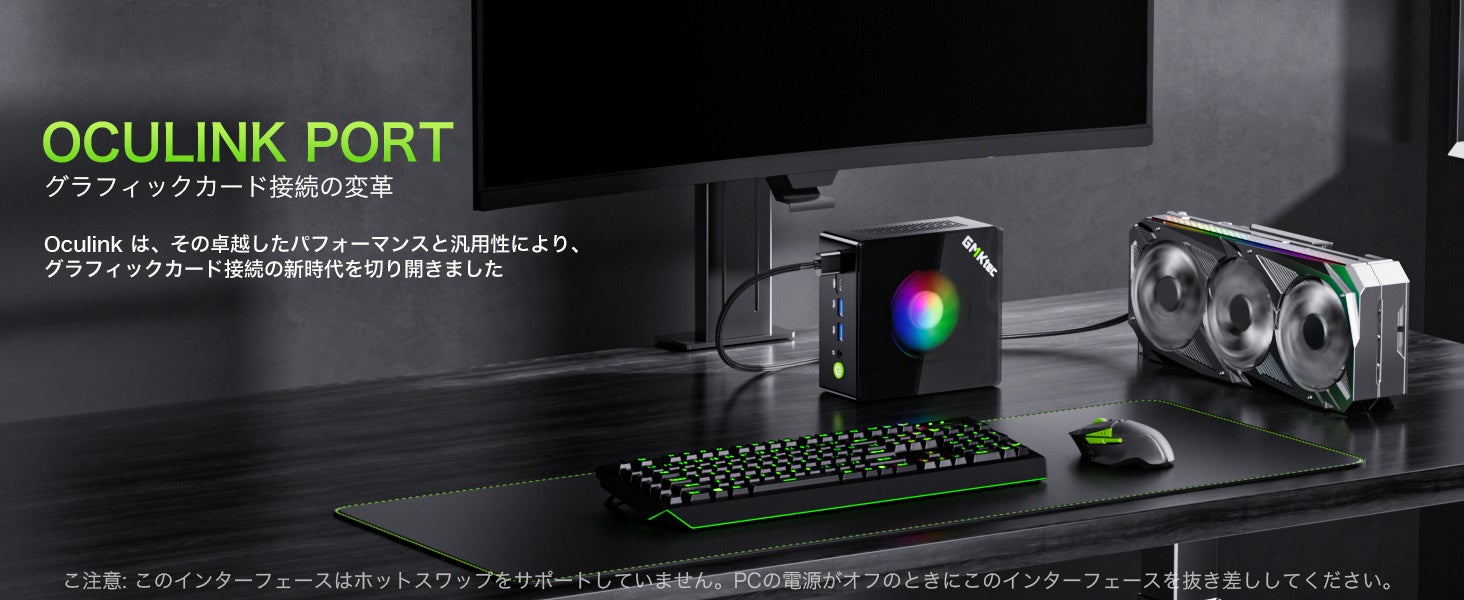 さらに、K11には Oculinkポート が搭載されており、これにより 外部GPU や その他の高性能デバイス を簡単に接続できます。OculinkはPCIe Gen4 x4の接続に対応しており、ストレージデバイスや拡張ボードの追加も可能です。ただし、Oculinkポートは熱挿抜に対応していない ため、接続・取り外しの際は必ず電源を切った状態で行ってください。電源が入っている状態での取り外しは、主板の破損を引き起こす可能性がありますので、注意が必要です。