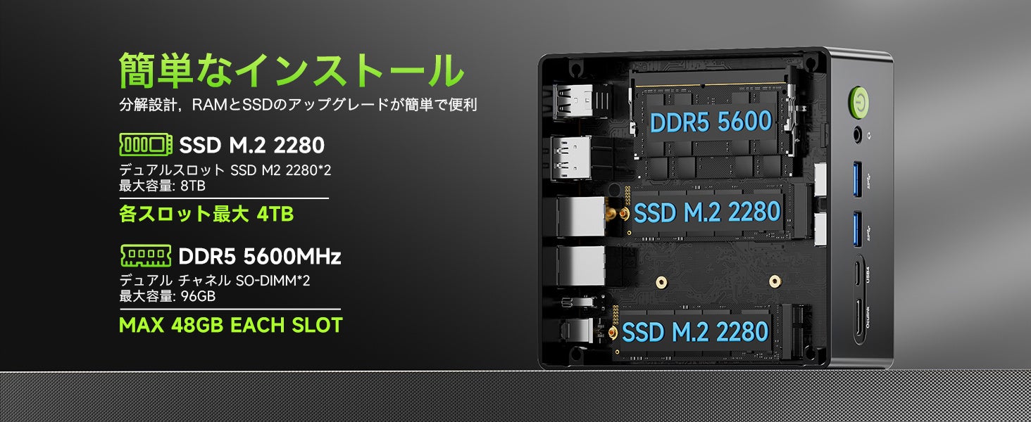 NucBox K11は、AMD Ryzen 9 8945HS(8コア16スレッド、最大5.2GHz)を搭載し、圧倒的なパフォーマンスを提供します。最新のTSMC 4nmプロセス技術に基づいており、システムの負荷に関わらず安定した処理能力を発揮。4K映像の編集や、リソース集約型のゲーム、デザインワークなど、あらゆる作業をスムーズにこなします。さらに、冷却性能に優れた設計により、長時間の使用でも過熱を防ぎ、安定した動作を維持します。
