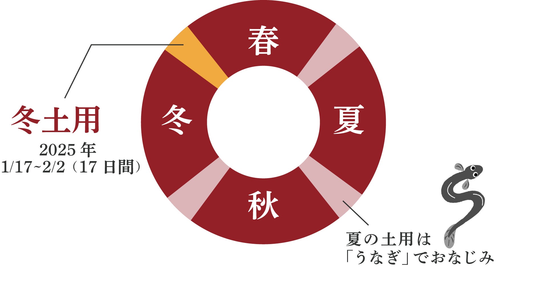 「土用の丑の日」というと一般的には夏のイメージがありますが、実は夏だけのものではないってご存じでしたか?土用とは季節の変わり目を意味し1年に4回(春・夏・秋・冬)あり、日本の季節の変わり目の目安となる「立春」「立夏」「立秋」「立冬」の前のそれぞれ約17日間のことを指します。