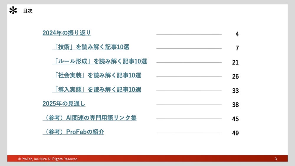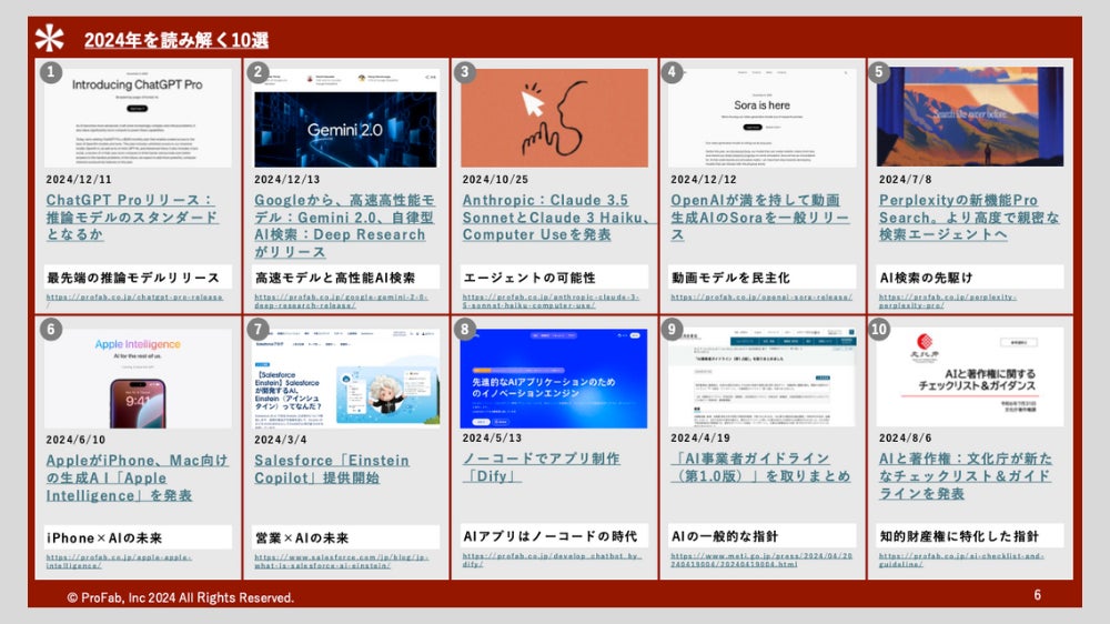 ニュースの詳細は個別ニュースごとに付与されているリンク先の記事から確認できます。また、AI関連の専門用語については説明ページのリンク集を用意しているので、そこから理解を深めることができます。後半には、2025年以降の展望についても触れ、AIを取り巻く環境が今後どのように変化するのか、未来を見据えた視点もお届けしています。