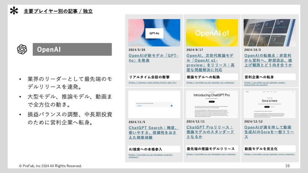 2022年11月にOpenAIがChatGPTをリリースしたことをきっかけに、生成AIの注目度は向上し、技術開発、市場投入に関するニュースも増えていきました。弊社では、生成AI導入を支援する傍ら、AI COUSOUというAIに関するメディアも運営しており(https://profab.co.jp/ai-cousou/)、週5本のニュース解説記事掲載を継続しています。日々進化するAI技術と、その社会実装に密着してきた1社として、皆さまに役立つ洞察や情報をお届けしたいと考え、本資料を作成するに至りました。