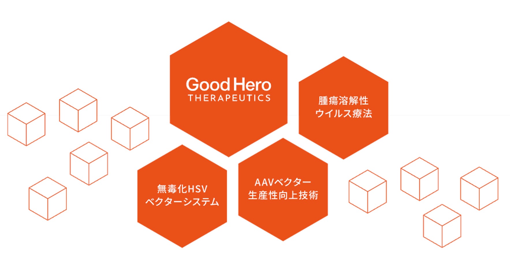 株式会社Good Hero Therapeuticsは、受容体標的化腫瘍溶解性ヘルペスウイルス(oHSV)の開発をはじめ、遺伝子治療用ベクターの無毒化技術、特定細胞への選択的感染技術、ベクター生産性向上技術など、遺伝子治療分野において革新的な技術を開発しています。これらの技術を基盤に、新たな遺伝子治療およびウイルス療法の実現を目指し、難病のない社会の創出に貢献しています。