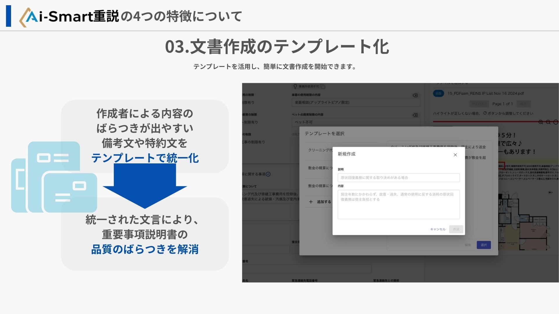 作成者による内容のばらつきがでやすい備考文や特約文をテンプレートで統一化することで、属人的な課題を解消し、重要事項説明書の品質のばらつきを解消します。