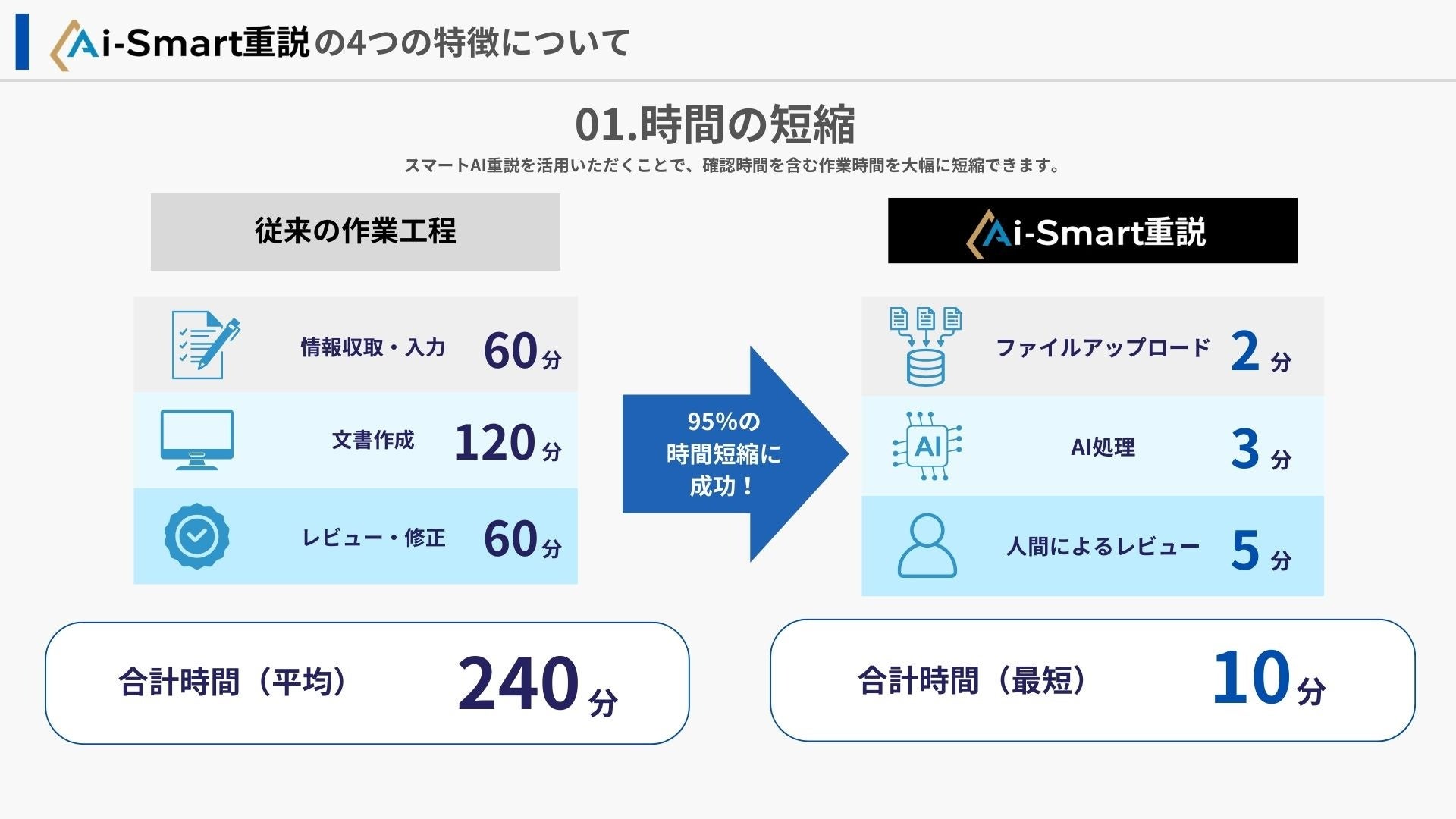 AIスマート重説を活用いただくと、確認・修正を含む作業時間を平均240分から最短10分まで削減する事が可能となります。今まで重要事項説明書・契約書の作成に要していた時間をより有意義な作業に当てることができます。