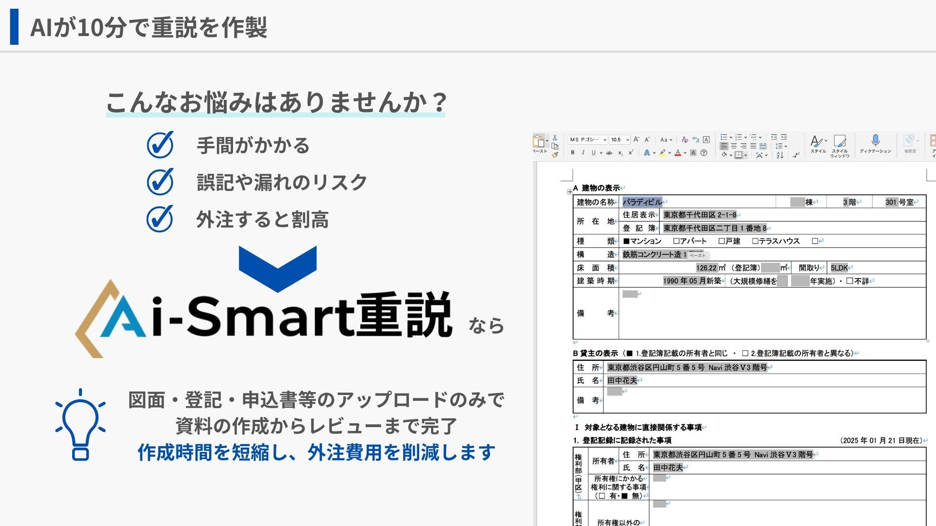 不動産の賃貸・売買共に説明が義務図けられる「重要事項説明書」の作成ですが、多くの手間と誤記や漏れのリスクを持ち、外注すると割高であるのが今までの不動産業界での現状でした。「AIスマート重説」はそのような課題をAIの力で解決し、作成時間を短縮して外注費用を削減します。