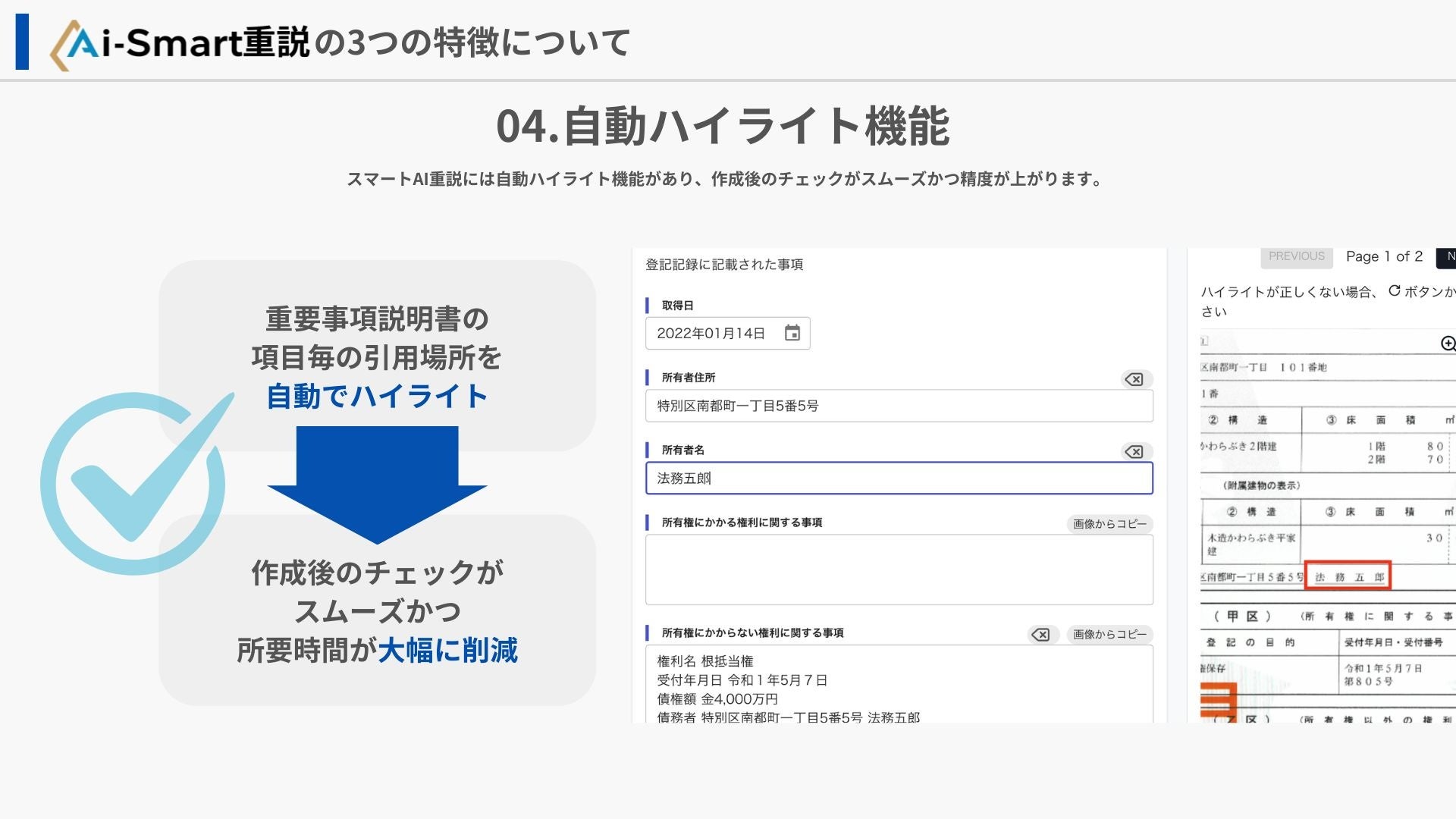 重要事項説明書は、作成はもちろん、レビュー・修正作業にも多くの時間を要します。「AIスマート重説」では引用個所をハイライト表示することによって、レビュー・修正を効率よく行うことができ、作業時間の大幅な削減が可能となります。
