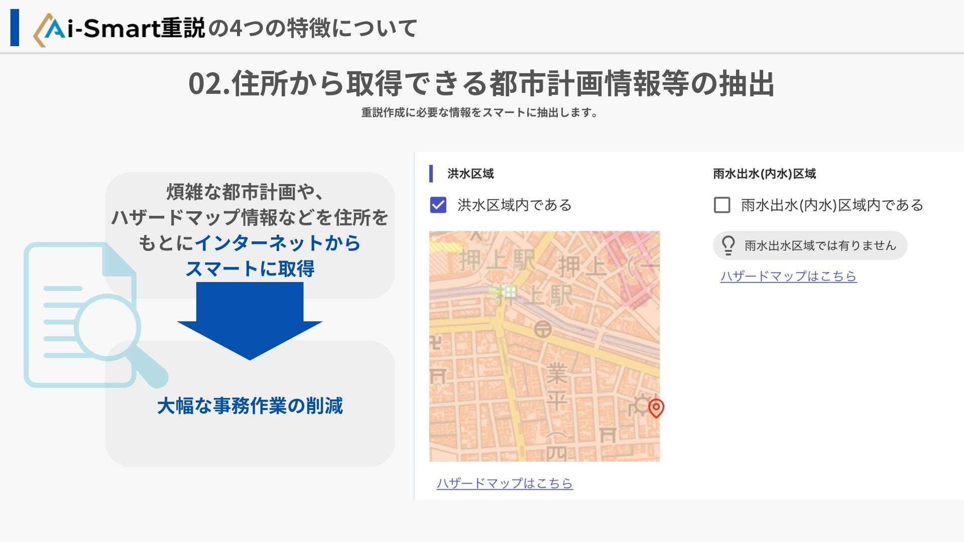 収集に手間のかかる煩雑な都市計画や、ハザードマップ情報などを住所をもとにインターネットからスマートに取得できるため、従来負担となっていた事務作業が大幅に削減されます。