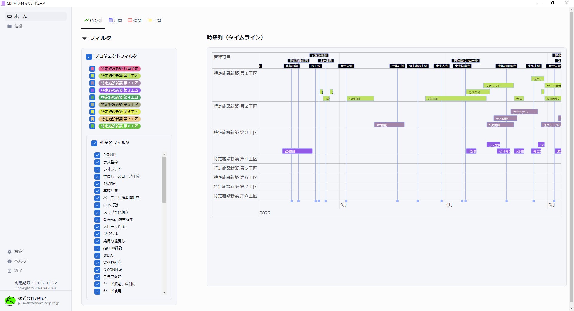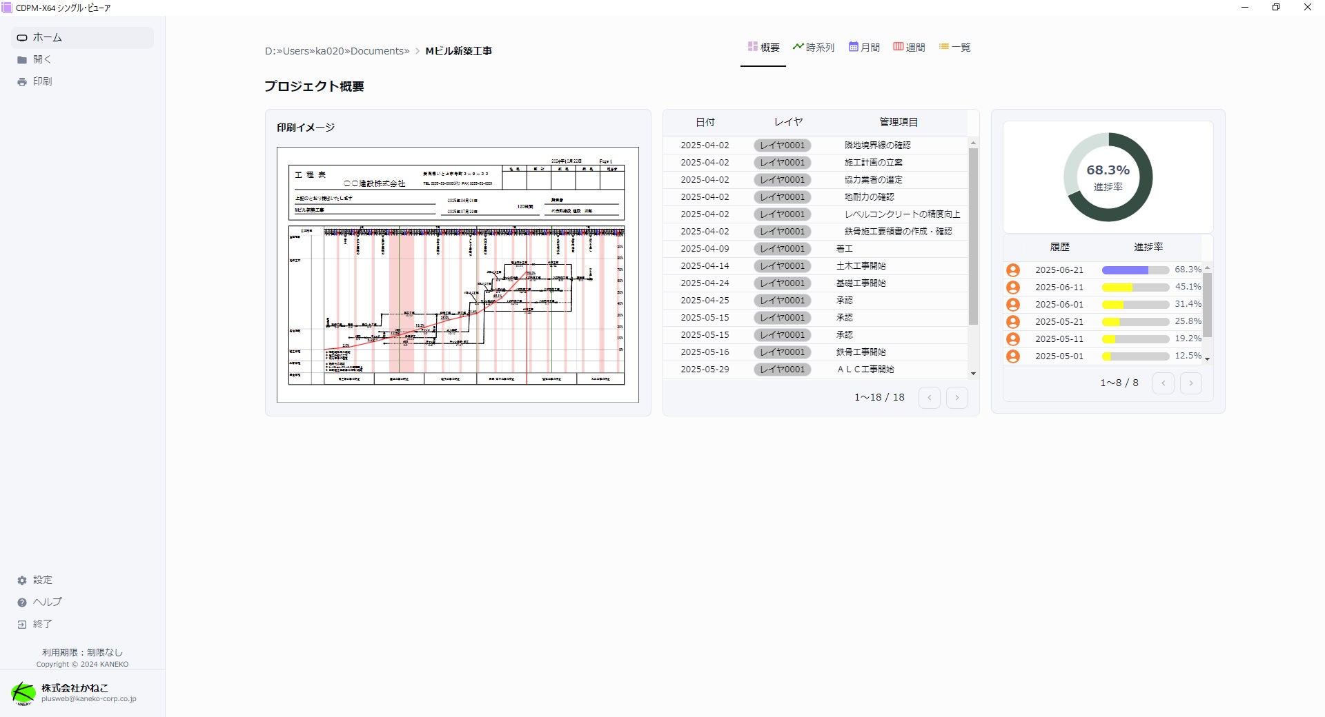 株式会社かねこ(新潟県糸魚川市大町2丁目、 代表取締役 金子 靖)は、建設業向けの工程表作成支援アプリ「CDPM-X64」の最新ビルド5545とシングル・ビューアを、本年12月18日にリリースしました。1991年のバージョン1.0リリース以来、長年にわたり建設業界の皆様にご愛顧いただき、心より感謝申し上げます。今回のビルドアップでは、業界初(2024年3月現在における日本国内の「工程管理システム」として:自社調査)となるJson形式でのデータ交換機能を強化し、インターネットやクラウド環境下において、OSSなどを活用することで、データ連携のハードルを大幅に引き下げることが可能となりました。これにより、さらに効率的なプロジェクト管理が実現します。