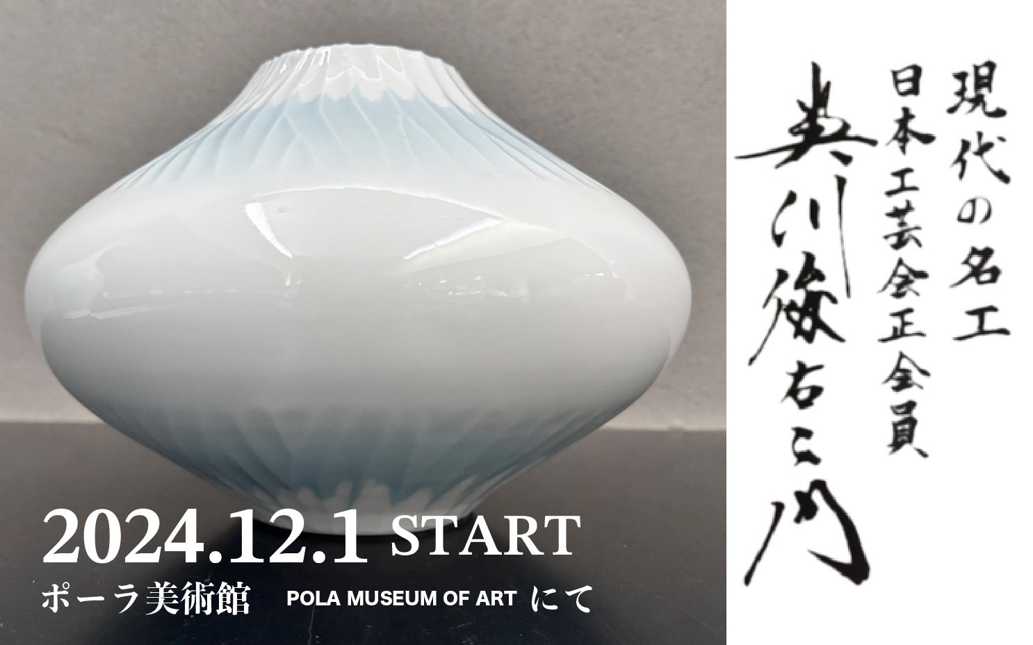 **1884年(明治17年)創業の晩香窯の、5代目当主の庄村健と6代目 庄村久喜による親子展は、今回が2回目。5代目 庄村健の作品は、青、赤で幻想的な艶と肌感をもった世界を表現。作品は英国の大英博物館でも収蔵されている。6代目 庄村久喜も個人陶芸作家として活躍。シルクパールのような繊細で可憐な光沢を放つ独自技法による白磁が特徴。国内外で高い評価を受け、2022年の陶美展では大賞受賞。今回は新しい作風の白磁も初公開。本年は、8月に広島、10月に福岡で展覧会を開催予定。