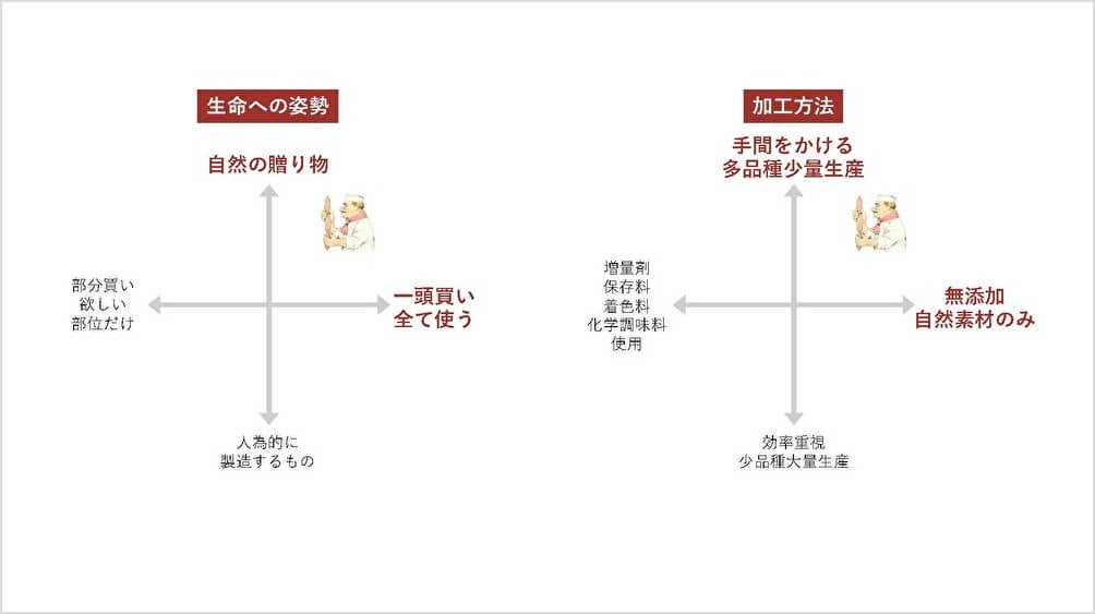 1976年に創業した老舗の食肉加工業者です。非常に手間のかかる少量多品種のモノ作りに徹している小さな肉屋です。牛や豚の生育から関与し、ドイツの事例に倣い、血管以外はすべて一頭まるごと使い切る製法を守り、食材を無駄にせず、自然への感謝を体現しています。人工添加物を使わず、自然素材のみで味を引き出す加工技術は、大量生産とは一線を画し、本物の価値を次世代につなぐ真のエシカルブランドです。ドイツの伝統製法を活用したハムやソーセージの品質は国内外で高く評価され、複数のコンクールで受賞歴を誇ります。