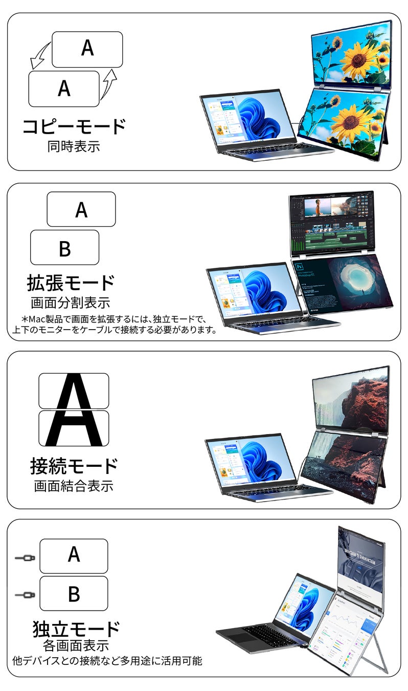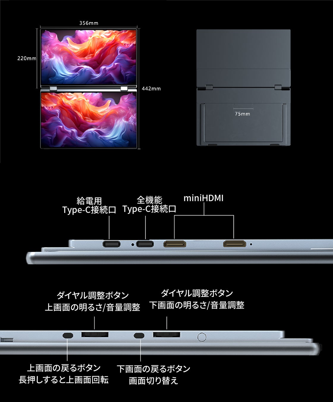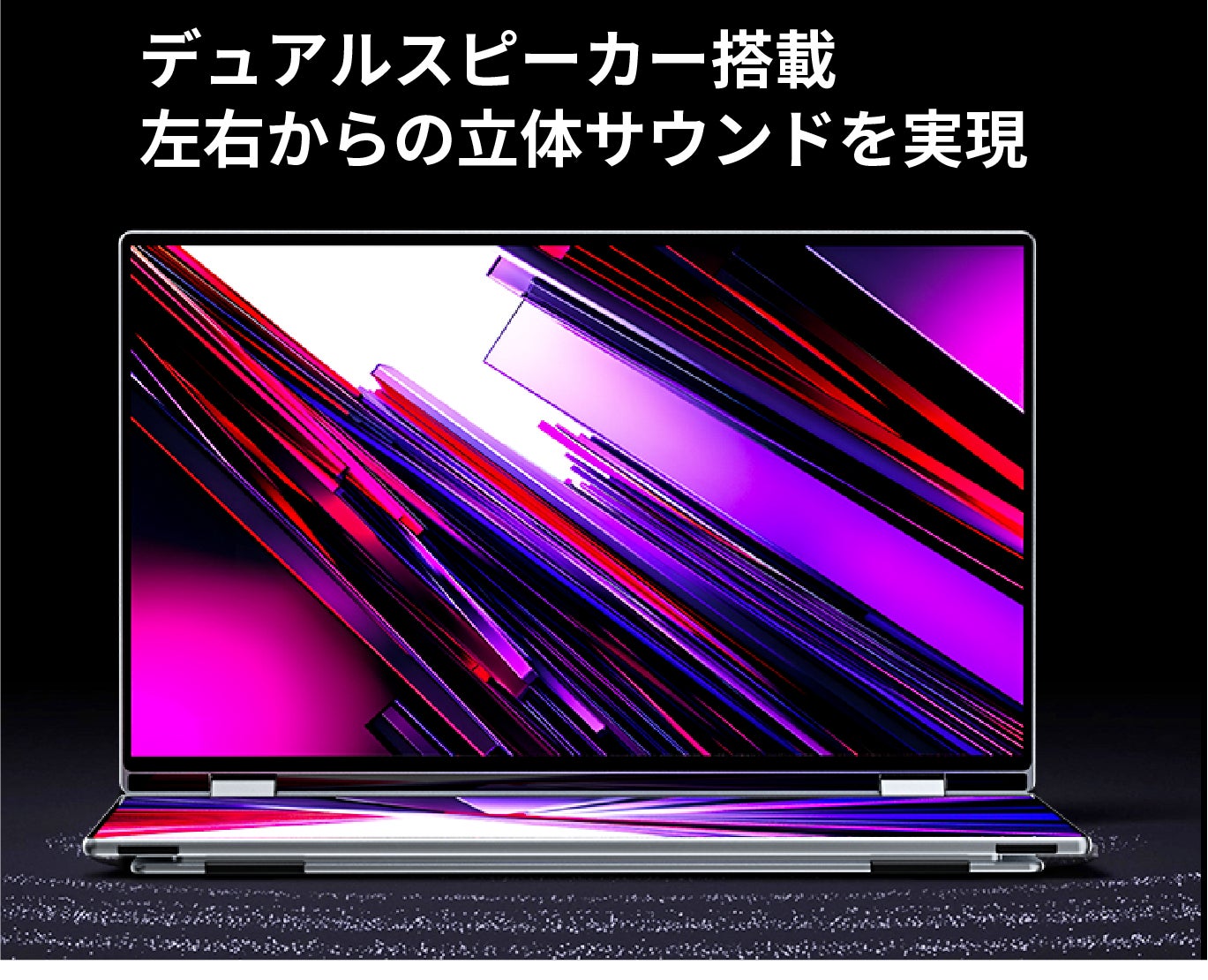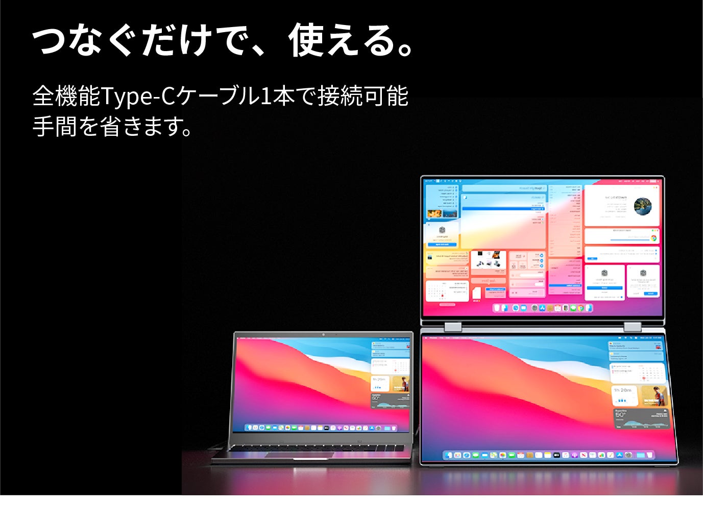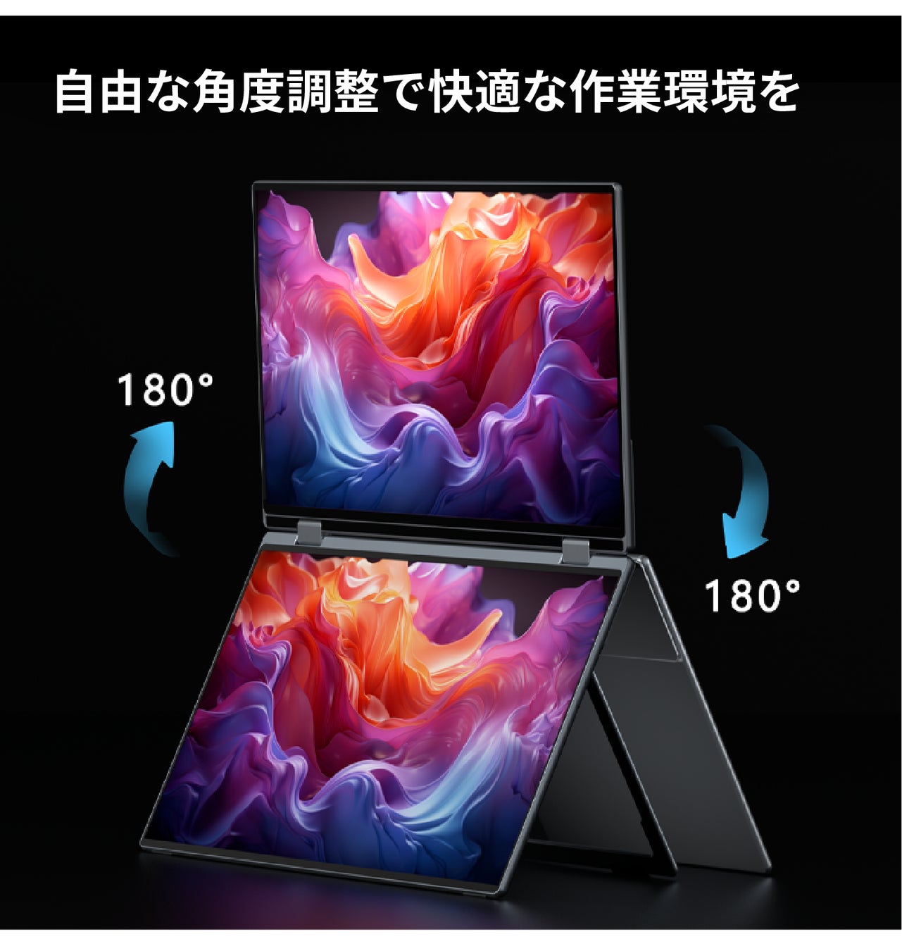 上の画面はワンプッシュで回転可能。用途や視点に合わせて自由自在に調整できます。プレゼンテーションや共同作業、動画視聴など、あらゆるシーンで快適な視聴環境を実現します。