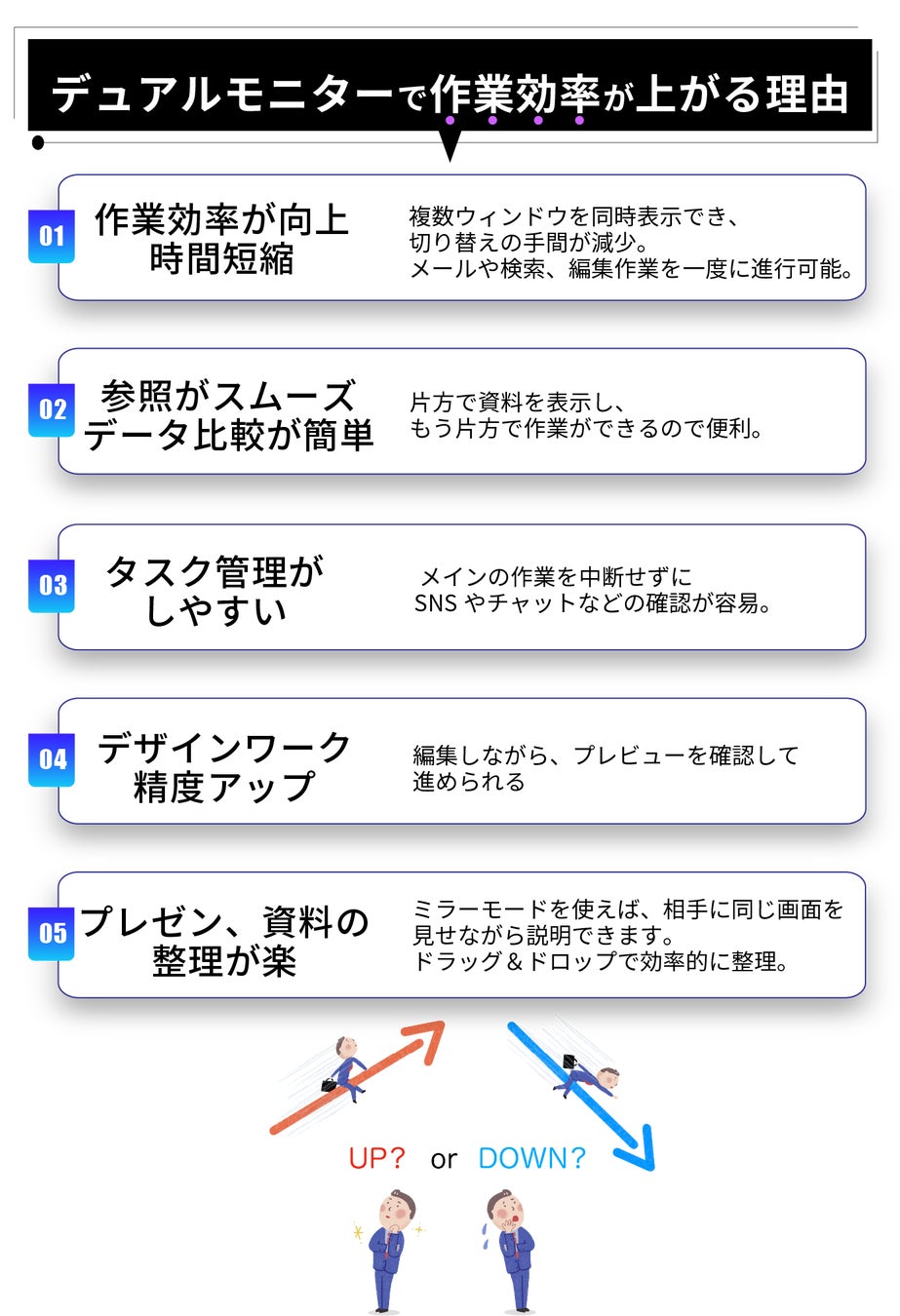 ドライバーの更新やインストール管理を気にする必要がなく、シンプルにモニターを使用できます。特にIT管理が難しい環境にも強く、初心者にとってわかりやすく、扱いやすいメリットがあります。