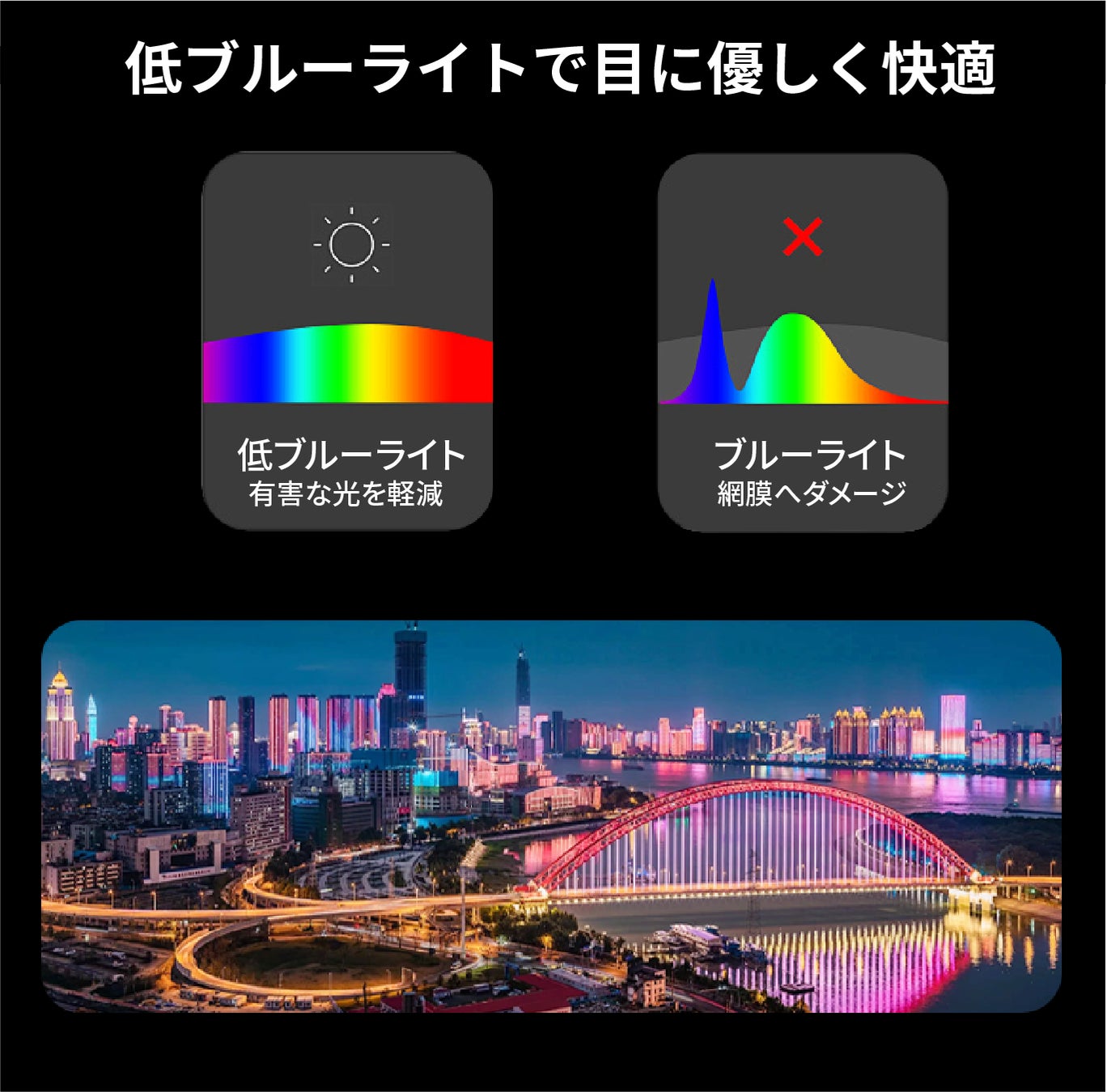 「低ブルーライト設計」とは、ディスプレイが発するブルーライト(青色光)の量を抑える設計のことです。ブルーライトは長時間の使用で目の疲れや不快感を引き起こすことがあるため、低ブルーライト設計では、視覚的な負担を軽減し、目に優しい画面を提供することを目的としています。