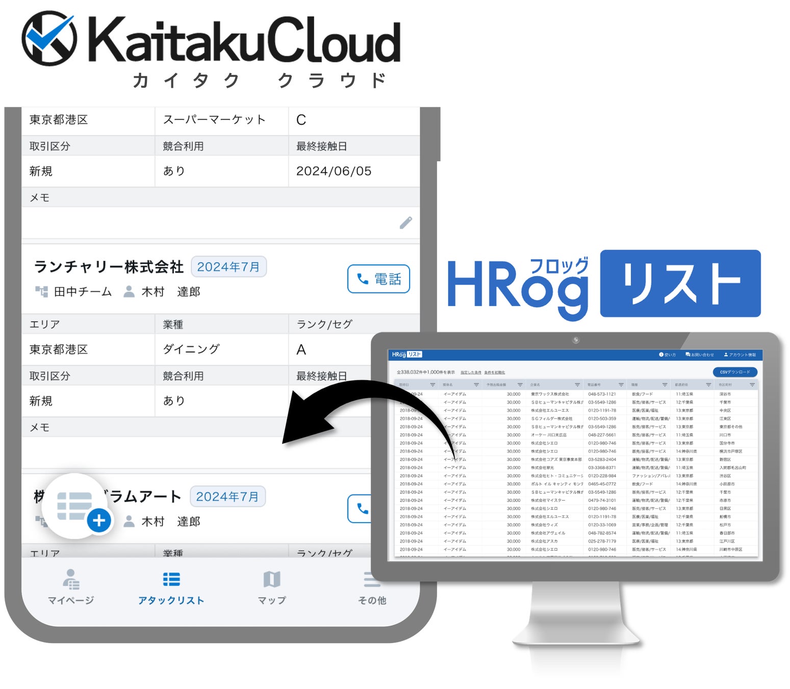 HRogリストの求人出稿データをKaitakuCloud(カイタク クラウド)に取り込むことで、企業の採用ニーズを把握し、効率的な営業活動を実現できます。