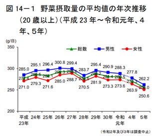 特に、2024年11月25日に発表された最新の厚生労働省「国民健康・栄養調査(令和5年)」においては野菜摂取量の大幅な低下が深刻で、令和元年の調査から令和4年に引き続き急激に減少。特に、若い世代の摂取不足が深刻ですが、全世代でさらに減少している現状があります。
