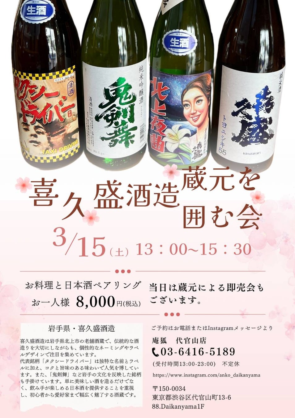 「代官山 庵狐」は飲むことも買うこともできるお店!「酒の会」3月は「タクシードライバー」の「喜久盛酒造(岩手)」の蔵元会&日本酒即売会。日本酒と、蔵元の料理をペアリングしながら楽しむことができます。